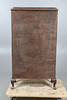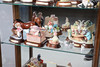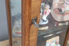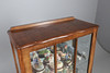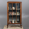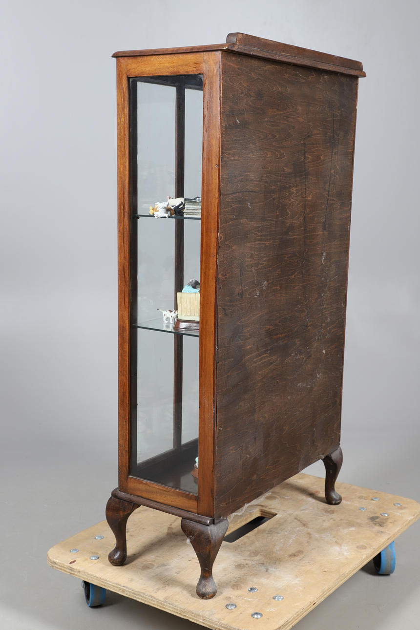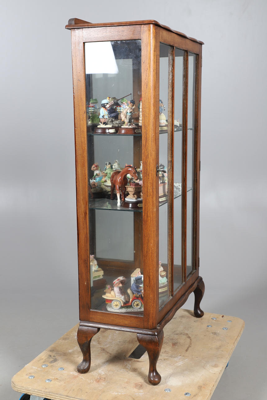 Die Mahagoni-Vitrine mit einer einzigen Tür, die drei lose Regale und verschiedene Harzfiguren zum Vorschein bringt. Höhe 108 cm, Breite 60 cm, Tiefe 28 cm.