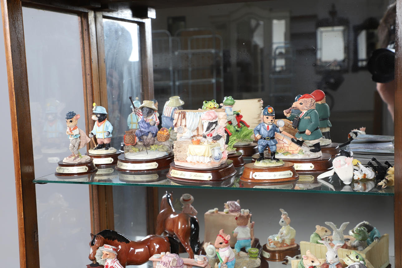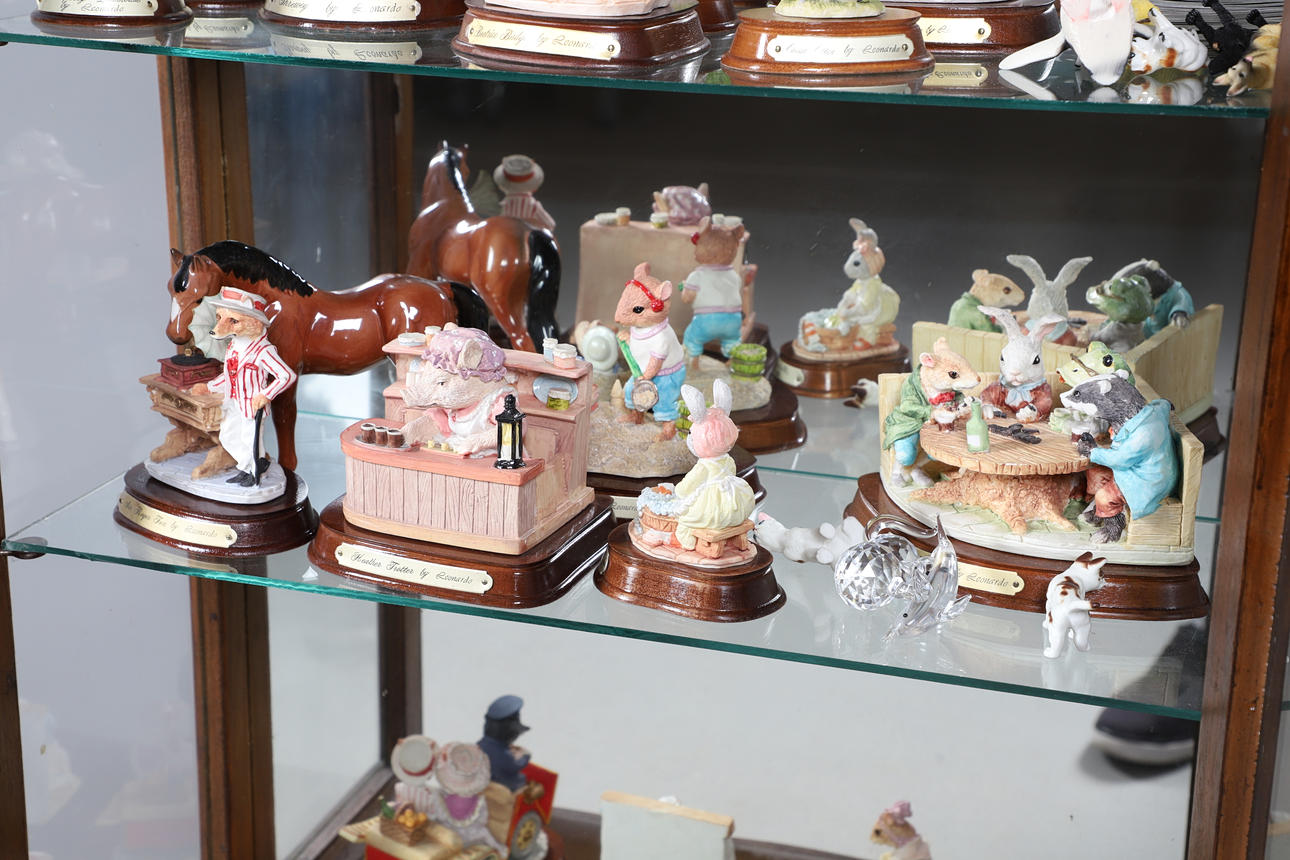 EINE SAMMLUNG VON HARZFIGUREN UND EINE KLEINE VITRINE.