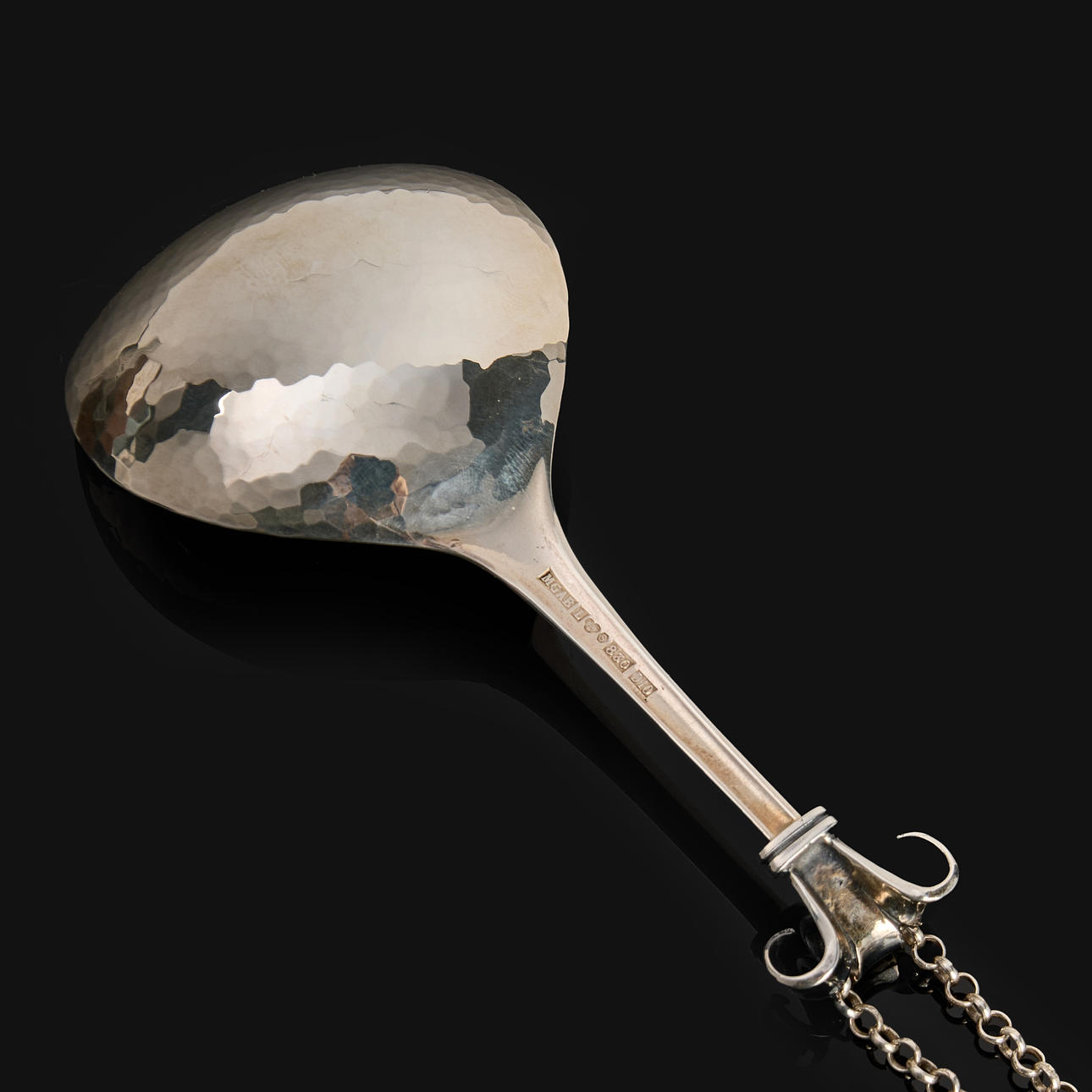 Dreiteilige Knospe, abgerundete Löffelklinge mit gehämmertem Dekor, mit Kette. Silber wiegt etwa 47 Gramm.