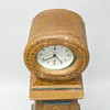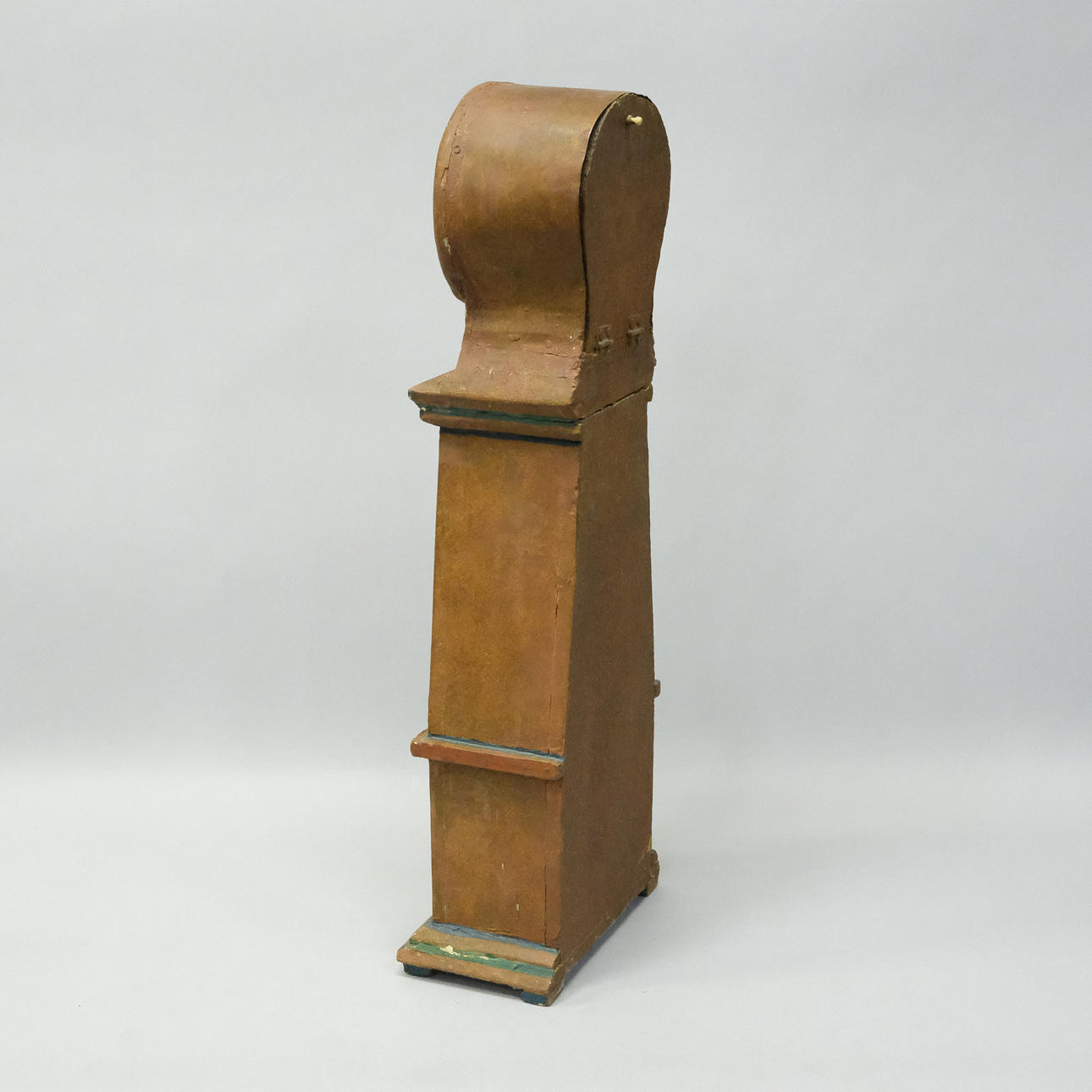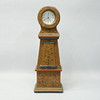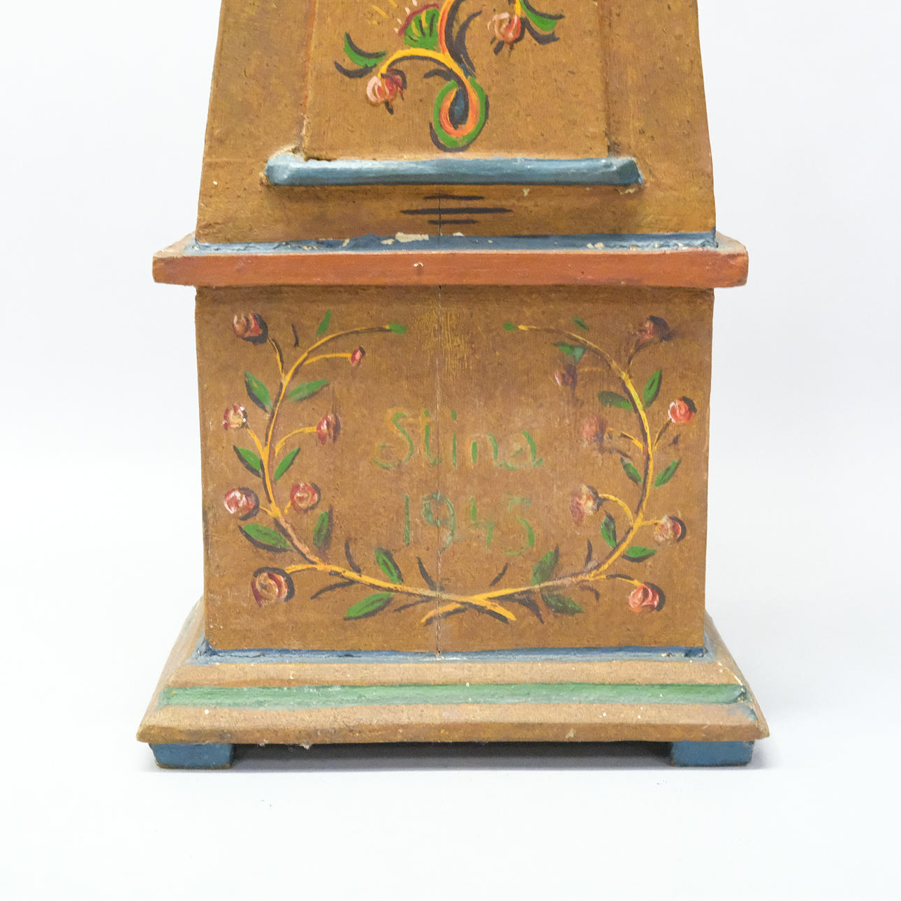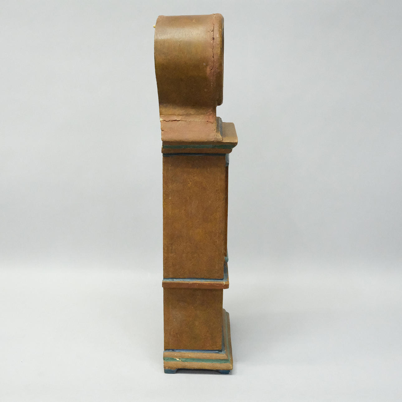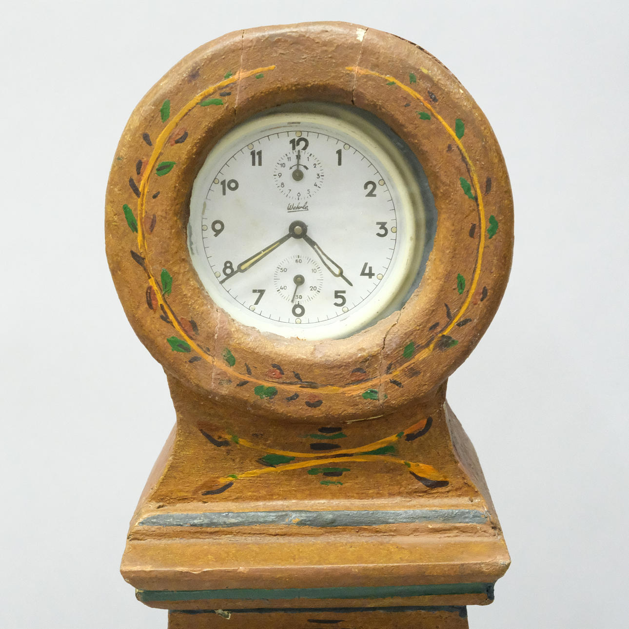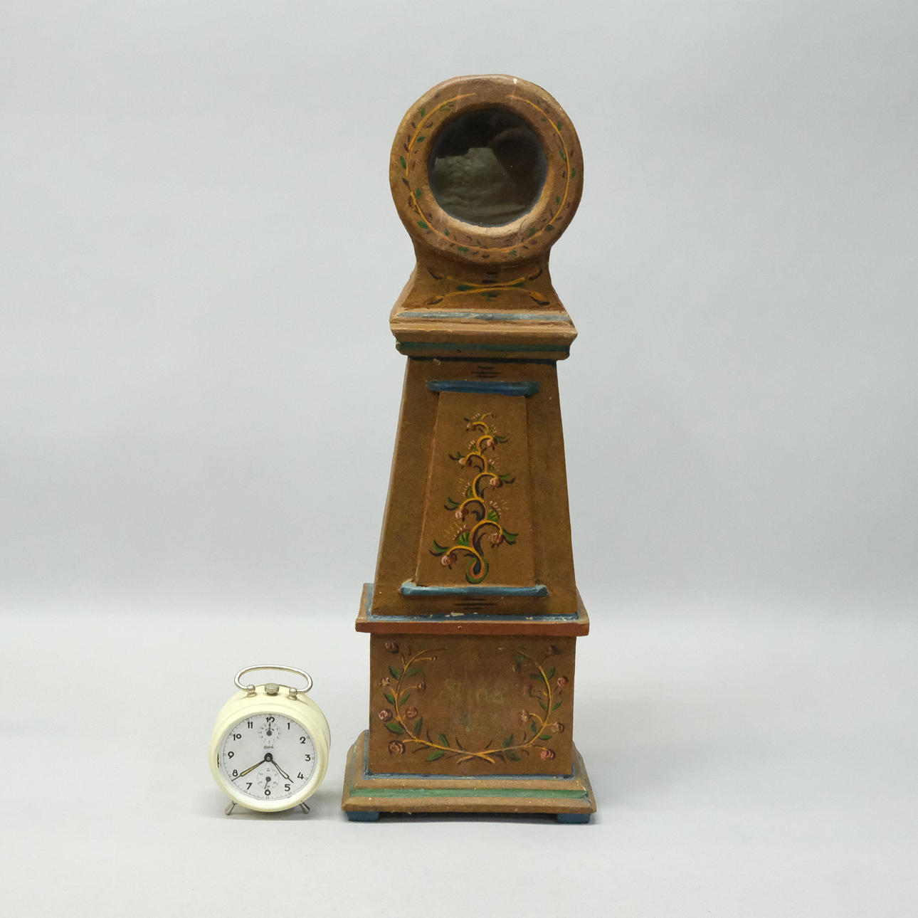 In Form einer Miniaturuhr von Mora aus Holz und Blech ist das Werk ein Wecker, Höhe 56 cm, Länge 20 cm, Tiefe 11 cm, bemalt, markiert mit Stina 1945.