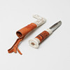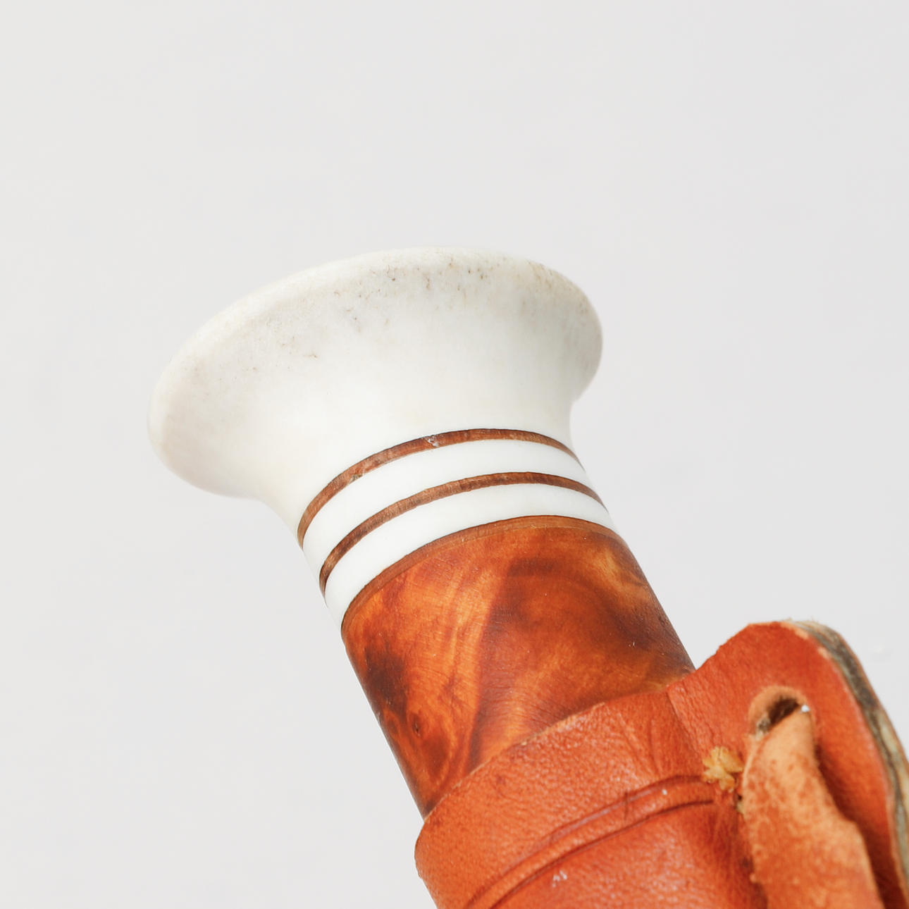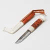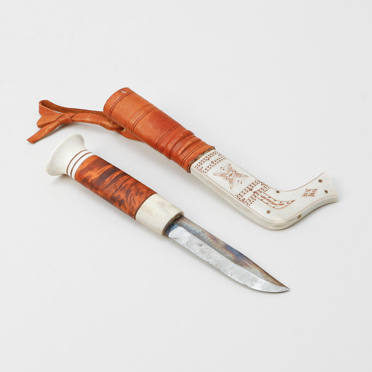 Hergestellt aus Leder, Birke und graviertem Rentierhorn in stilisiertem Dekor. Die Klinge ist mit „B & S“ gestempelt.