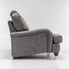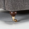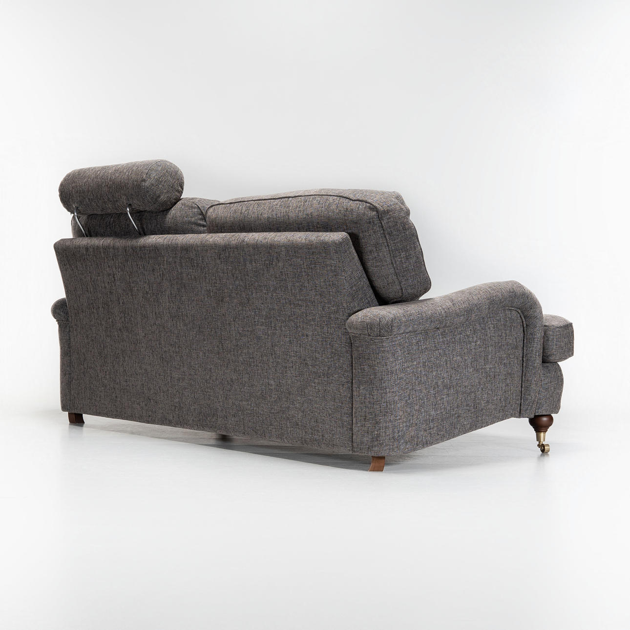 Beine aus gebeizter Buche, Vorderbeine auf Messingtraversen. Vollständig gepolstert mit abnehmbarem Plüschfutter, Stoffpolsterung in Graphitgrau.