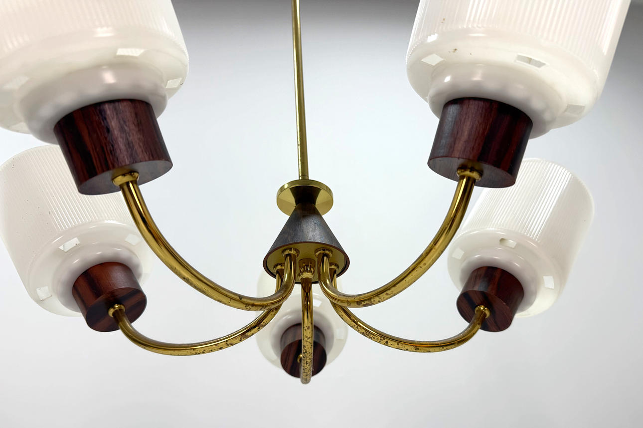 4325397. DECKENLEUCHTE Mitte 1900, Messing, Holz, Kunststoff.