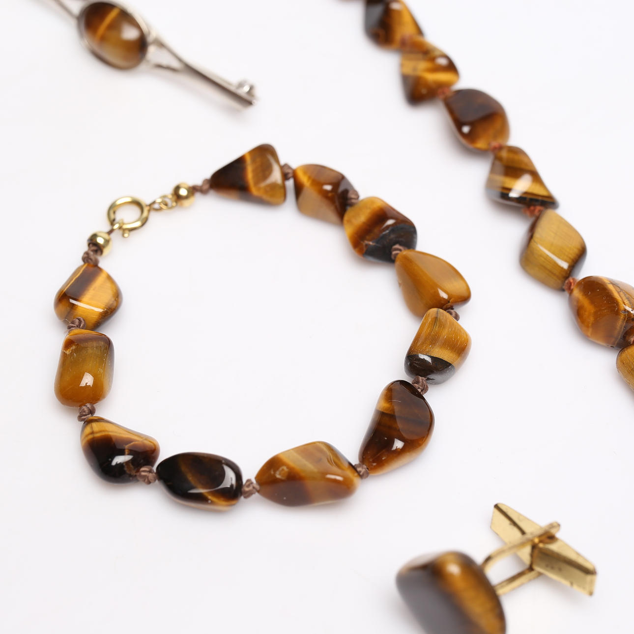Halskette, Armband, Manschettenknöpfe und Brosche.
