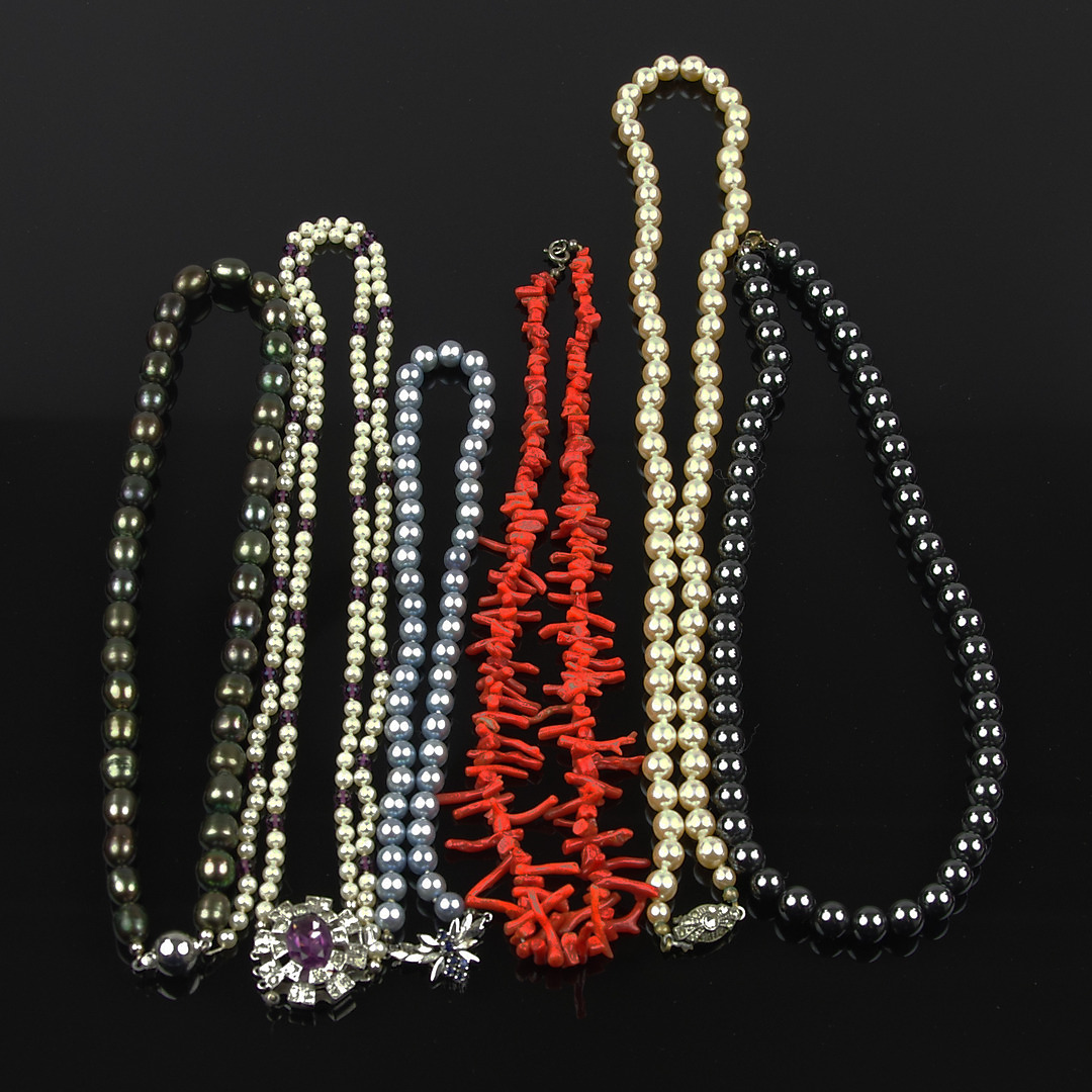 432788. HALSKETTE, 6 Stück, inkl. A. Zuchtperlen.
