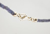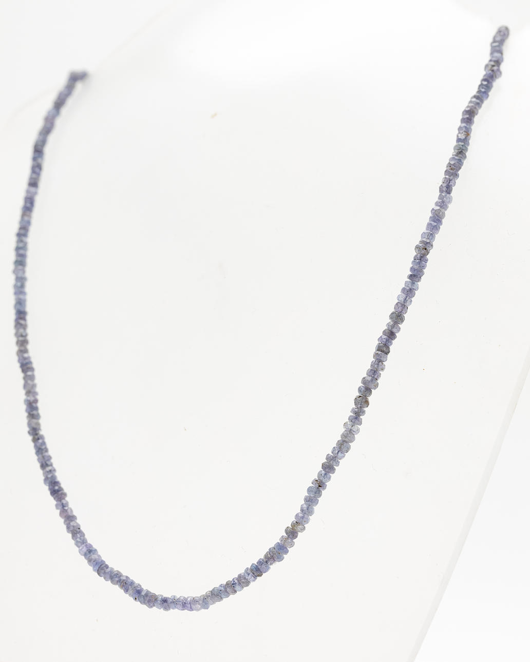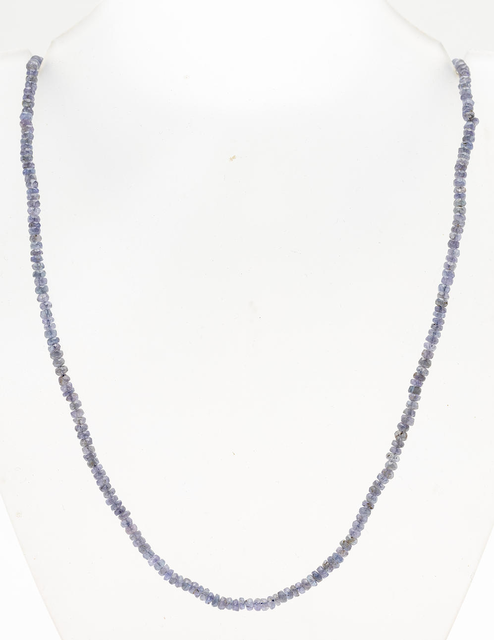 Halskette, facettierte Tansanit Perlen, aufgezogen, mit silbernem Verschluss montiert. Maße ca. Tansanit Durchmesser Ø 3 mm. Kettenlänge 50 cm. Gewicht inkl. Verschluss ca. 52.6 ct.