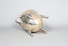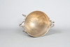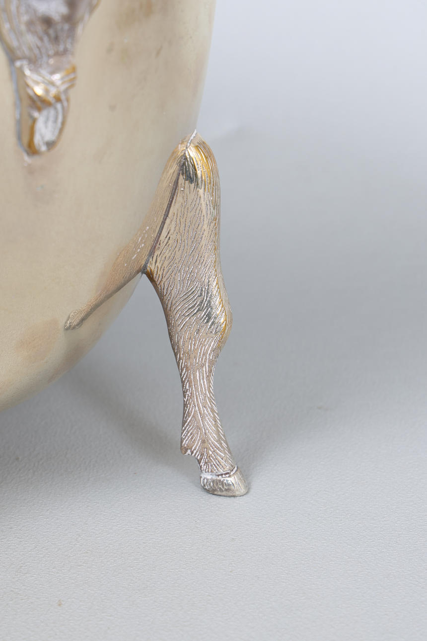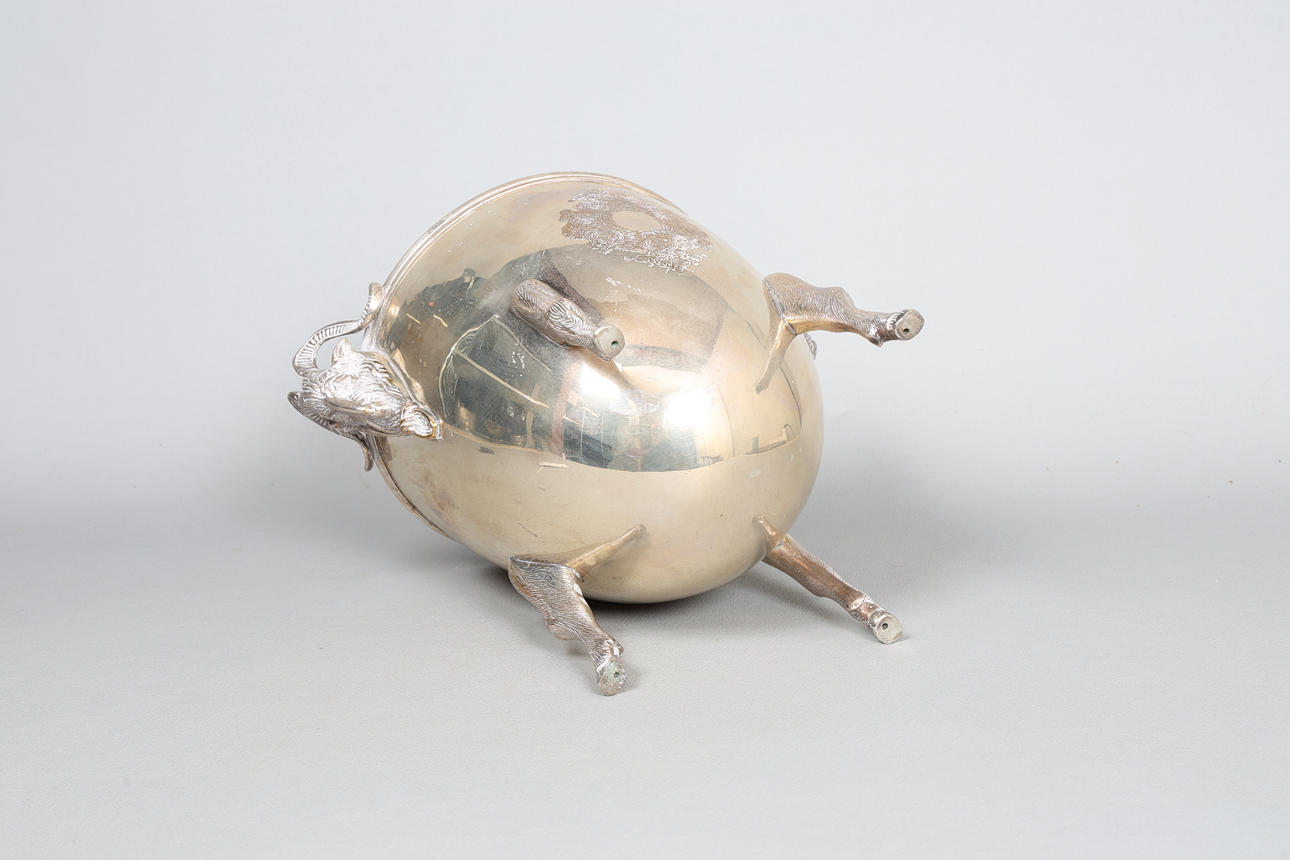 Mit Widderkopfgriffen, der eiförmige Körper mit gravierten Rollkartuschen, die auf vier Huffüßen hochgezogen sind, an den Griffen 30 cm breit, 21,5 cm Durchmesser, 24 cm hoch.
