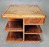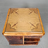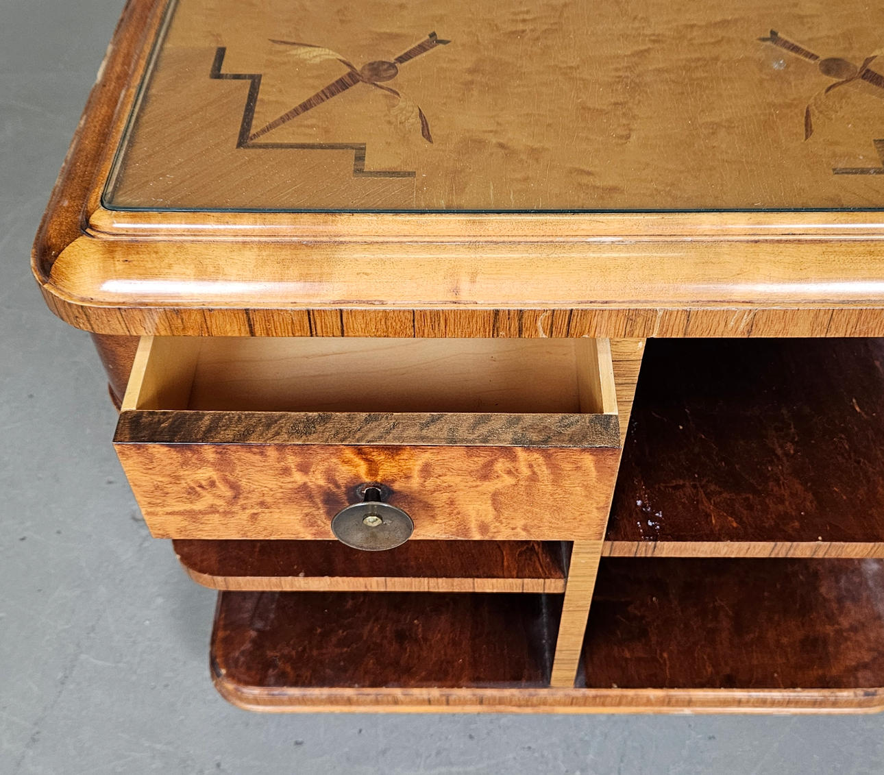 Hartholz, Brett mit Intarsie, lose Glasplatte, drehbar, ca. 60x60, Höhe 57 cm.