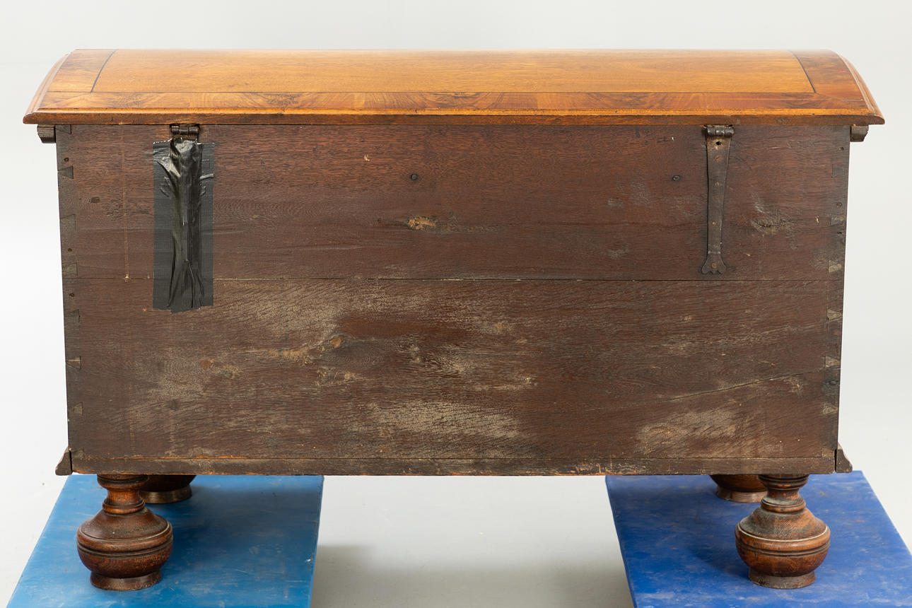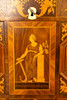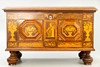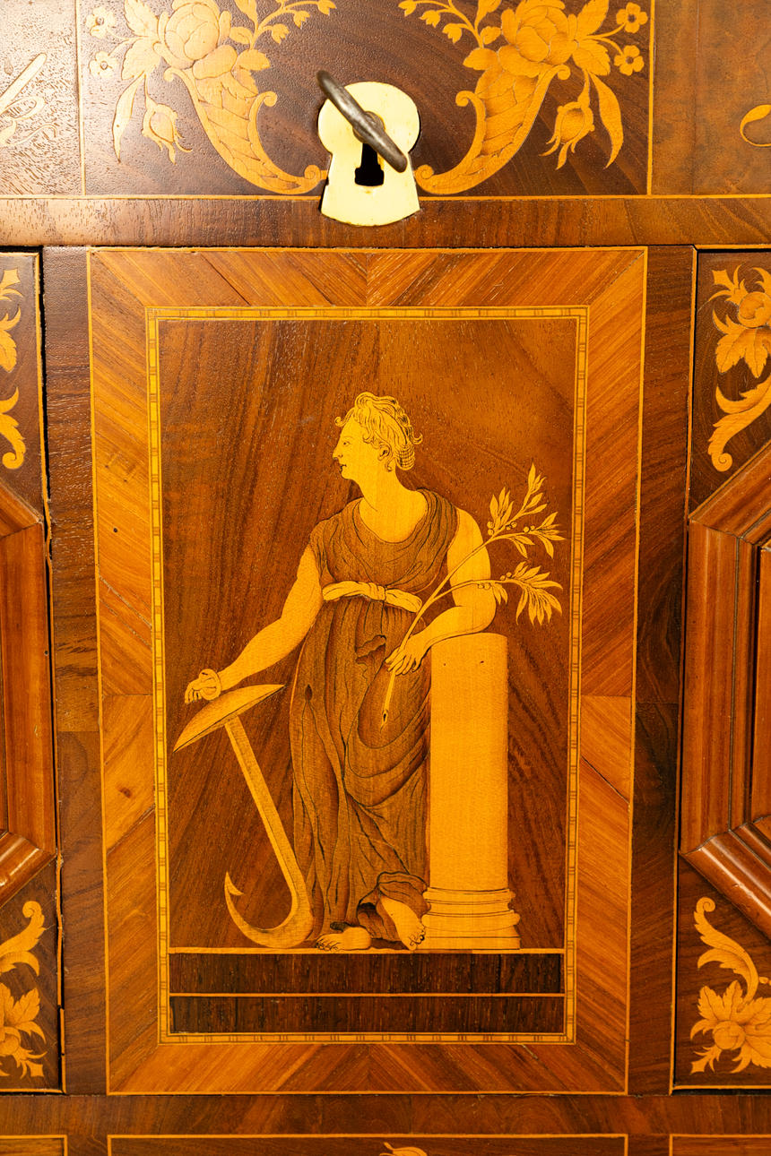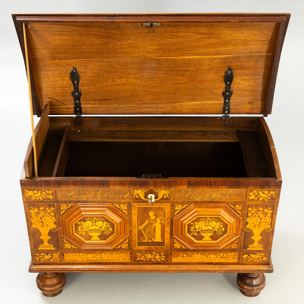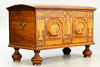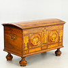 Eiche, Mahagoni, Ahorn und a. Hölzer, Messing, Schlüsselschild aus Bein. Rechteckiger Korpus auf profilierten Ballenfüßen. Leicht gewölbter Deckel. Die Front durch gerahmte Füllungen gegliedert. Darin passige Vasen, Blumenr, anken, teilweise mit Vögeln besetzt . Mittig zwei Bastionsfüllungen , flankierend die Allegorie der Hoffnung. Abschließende Besitzerbezeichnung ´Anne Neunverk`- Ànno 1857`. Seitlich montierte Messinghenkel. HxBxT: ca. 88 x 138 x 68 cm.