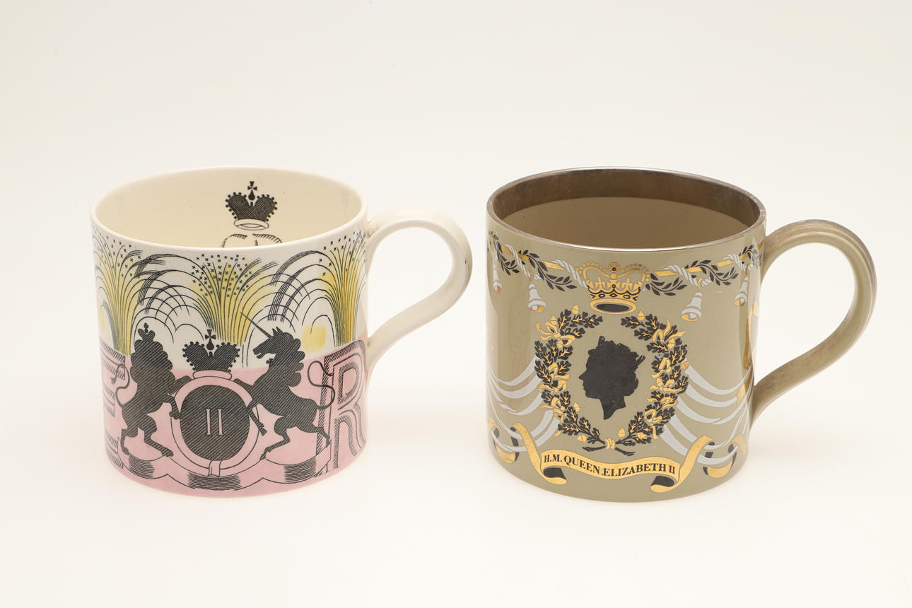 Eine Wedgwood-Tasse, entworfen von Eric Ravilious für die Krönung von Königin Elizabeth II im Jahr 1953 (10,5 cm hoch). Außerdem mit einer Wedgwood-Tasse, entworfen von Richard Guyatt zum 25. Hochzeitstag von Königin Elizabeth und Prinz Philip (10,5 cm hoch). (2).