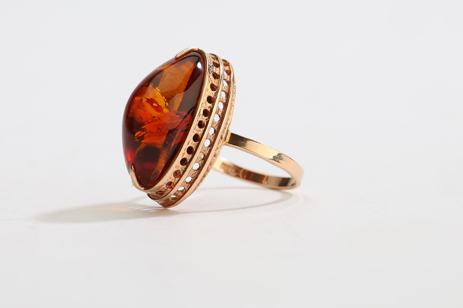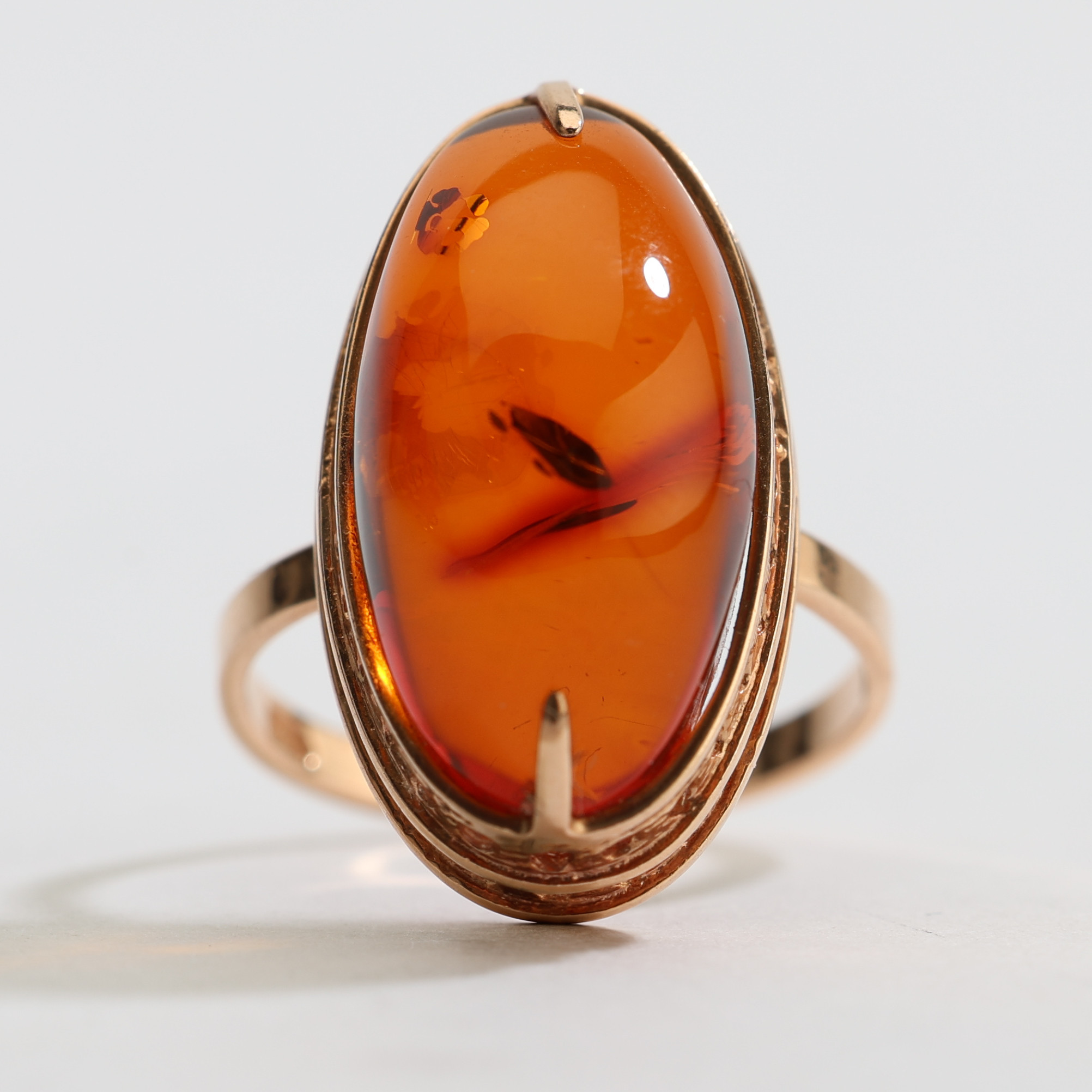 4333069. RING, 14-karätiges Roségold mit Bernstein im Cabochon-Schliff.