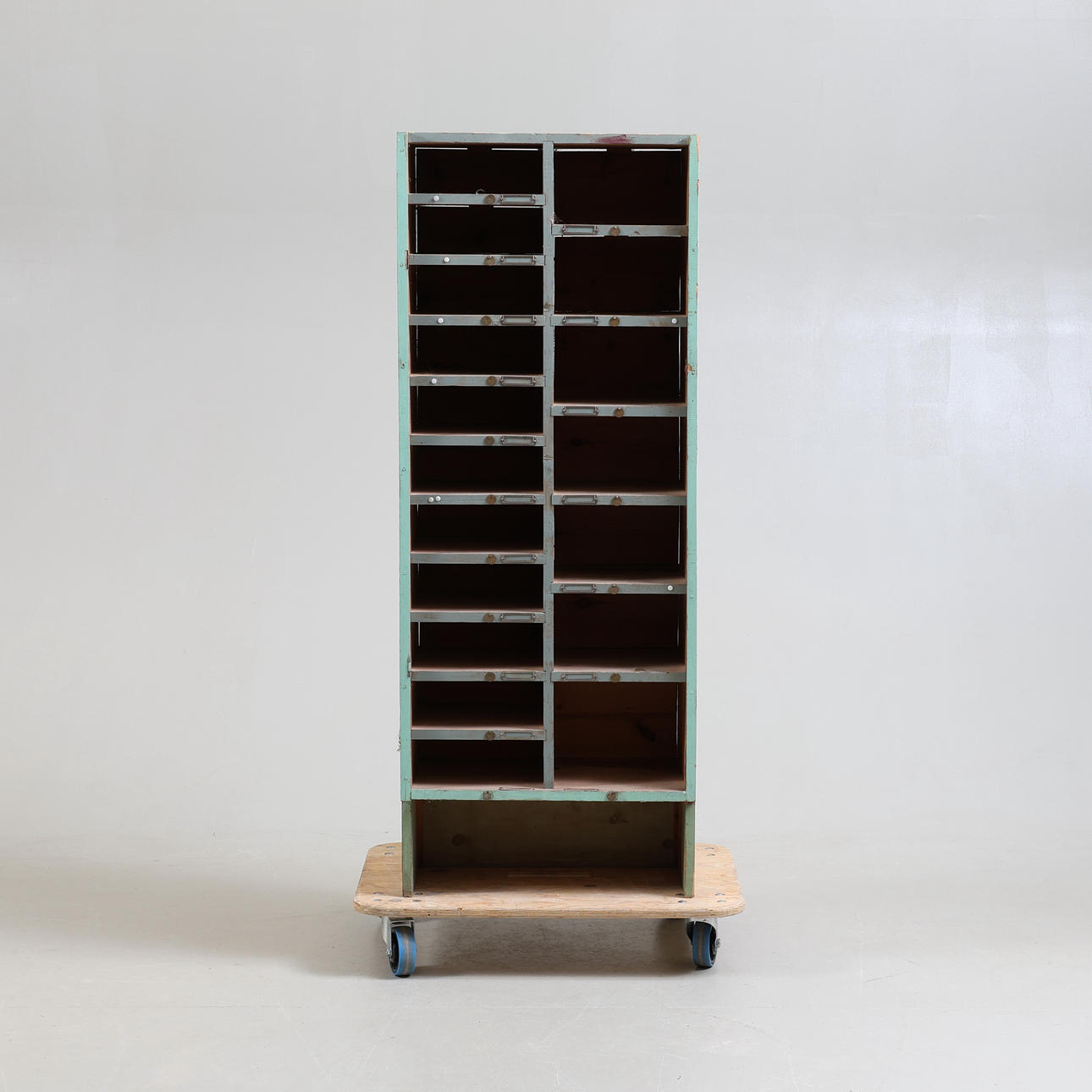 Briefkasten mit 18 Fächern, teilweise bemalt Länge 60, Breite 36, Höhe 155 cm.