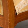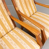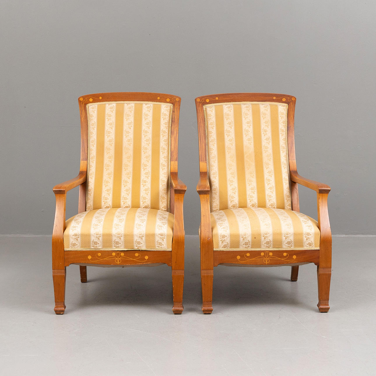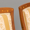 Zwei Sessel mit Nussbaumgestell mit Intarsiendekor, gepolsterter Sitzfläche und Rückenablage.