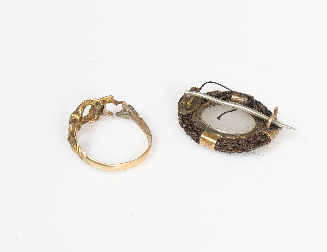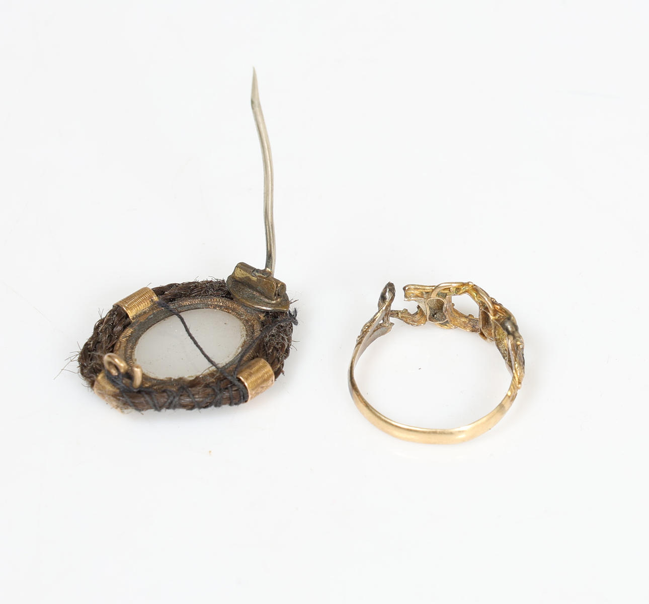 Der 12-karätige Goldring ist mit zwei Perlen besetzt, 1 g, die vergoldete und geflochtene Haarbrosche in ovaler Form (2).