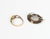 Der Ring ist beschädigt und es fehlen drei Steine, die Brosche wurde mit schwarzem Faden repariert.