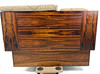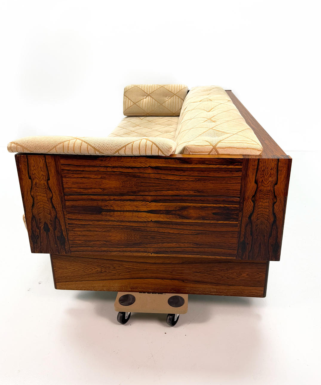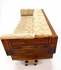 Dunkel gebeiztes Holz mit viel Muster, ausziehbares Bett auf die gleiche Höhe wie das Tagesbett angehoben