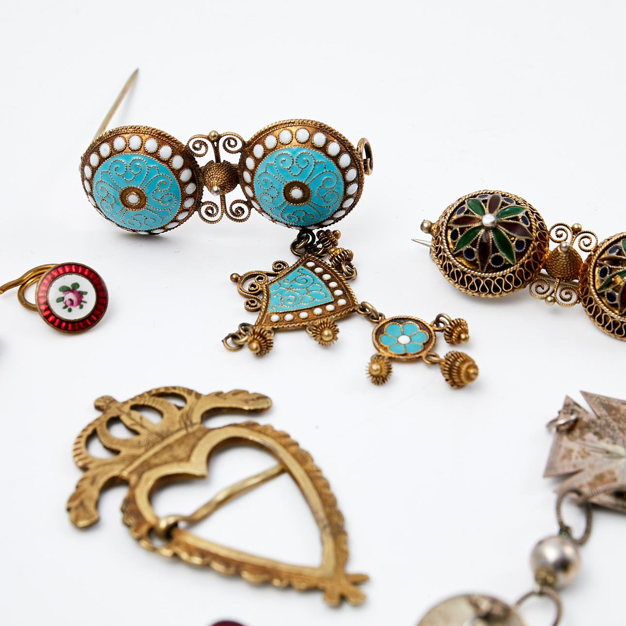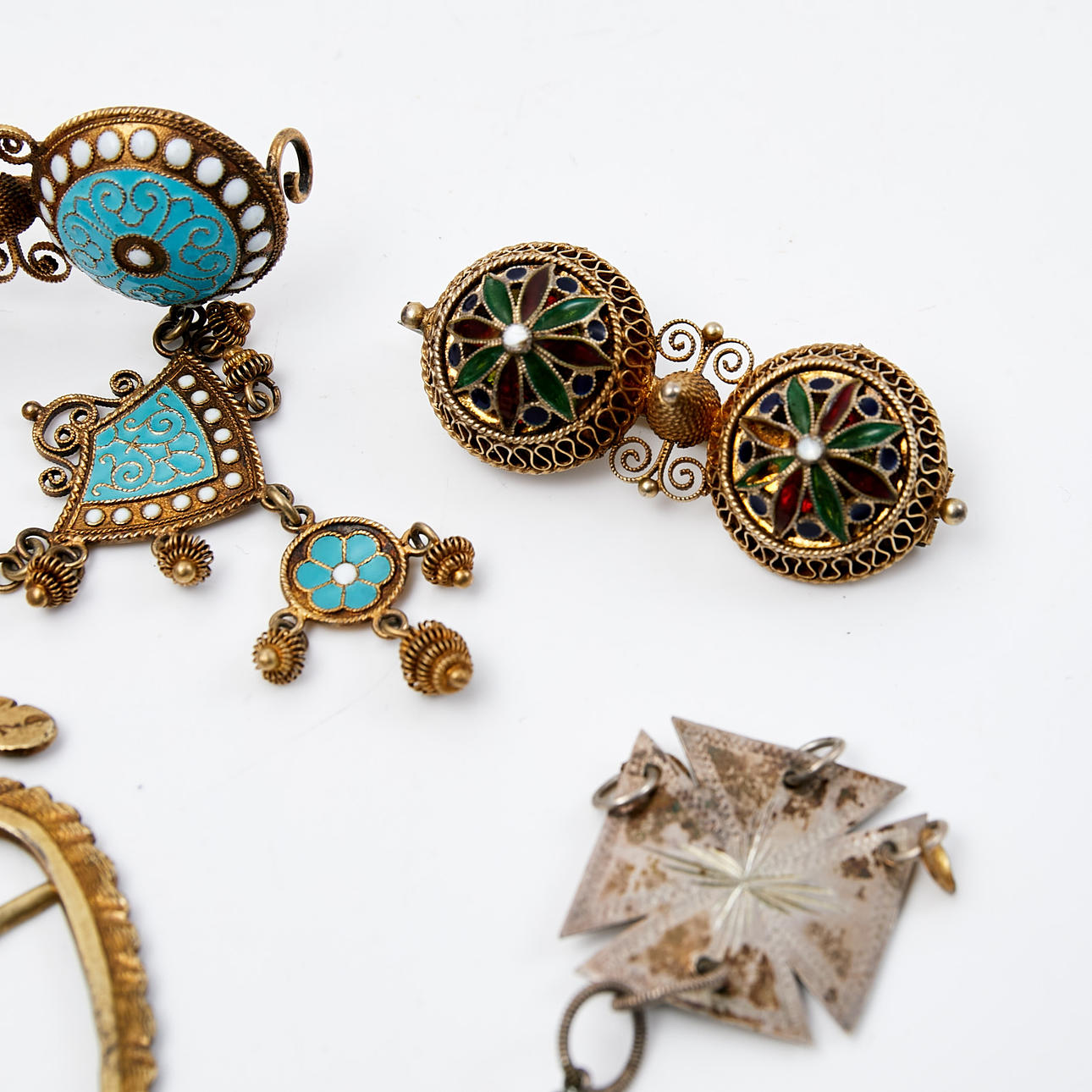 4339273. MODESCHMUCK, 7-teilig, Silber, Edelmetall und Emailarbeit.