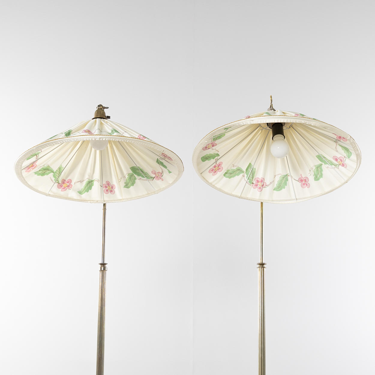 Hochschieb- und verstellbare, textile Bildschirme, Höhe ca. 155 cm, Schirmdurchmesser 54 cm.