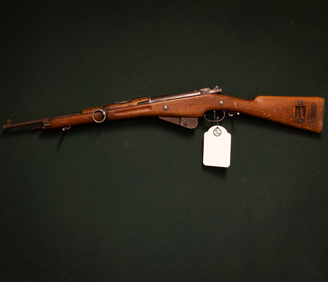 Französischer Karabiner. Fabrikat Berthier Modell 1892. Kaliber 8mm Lebel. Zusätzliche Nr. 1265. Länge des Auslaufs 45 cm. Einstellbares Visier. Plünderbares Magazin. gerader Kolben mit hinterer Stahlkappe.