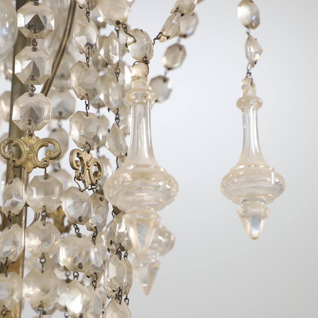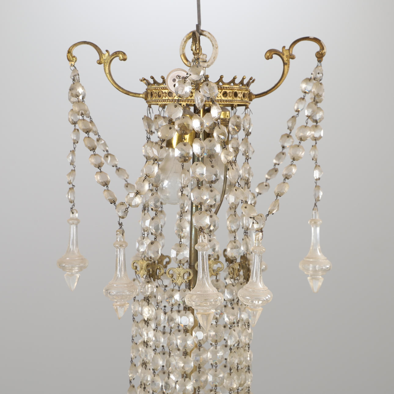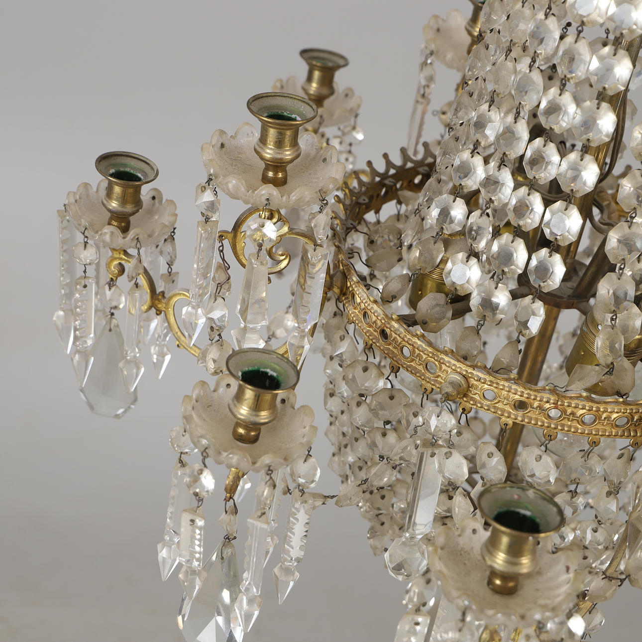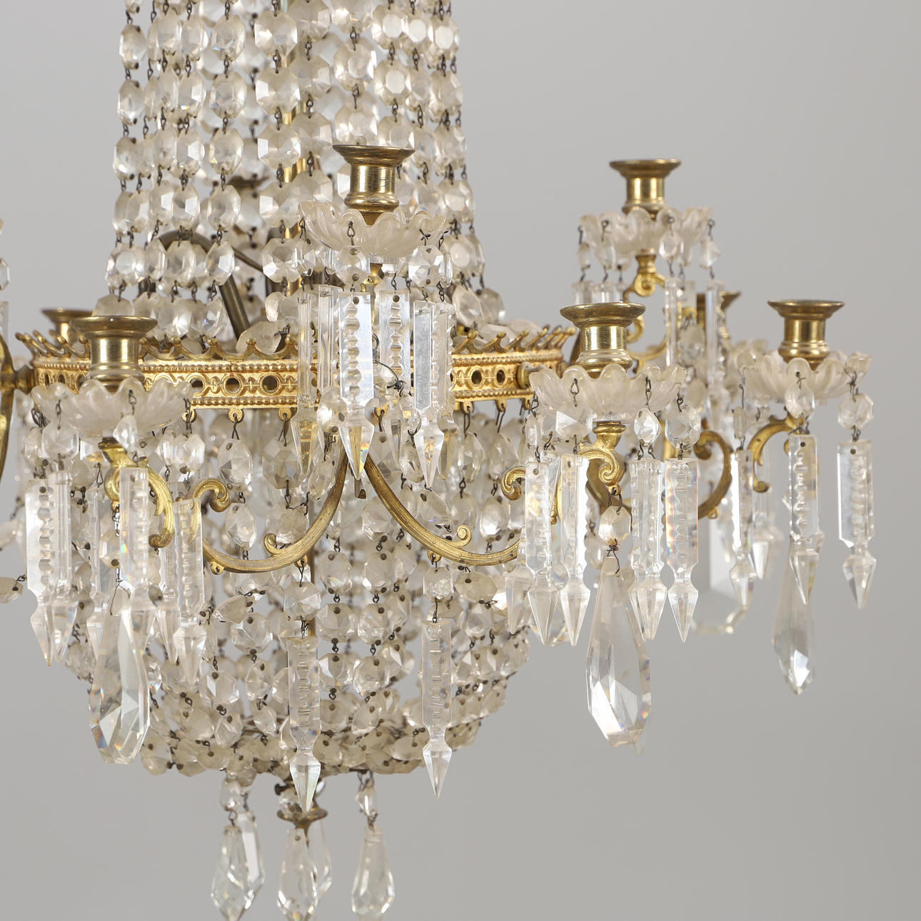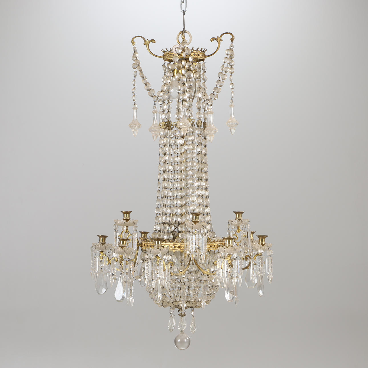 4344461. KRONLEUCHTER, 12-armig, Messing mit Prismen, Oscarian.