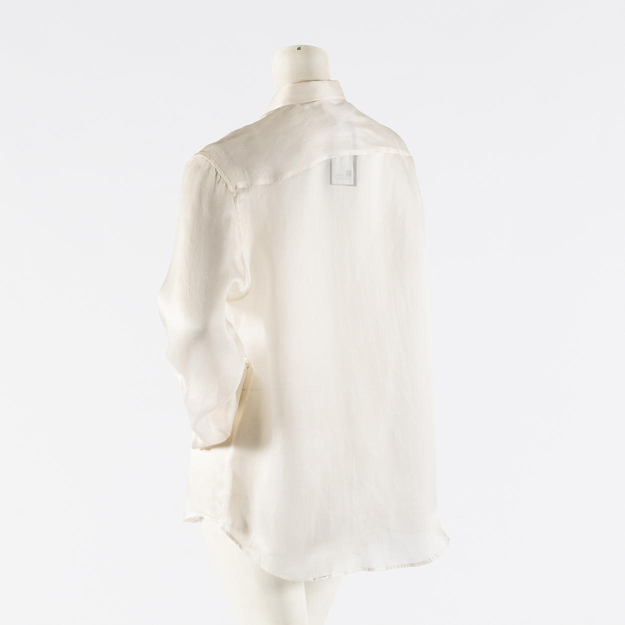 aus cremefarbener Seidenvoille mit Perlmuttknöpfen. Brusttaschen Brustweite ca. 100 cm, Länge ca. 74 cm.
