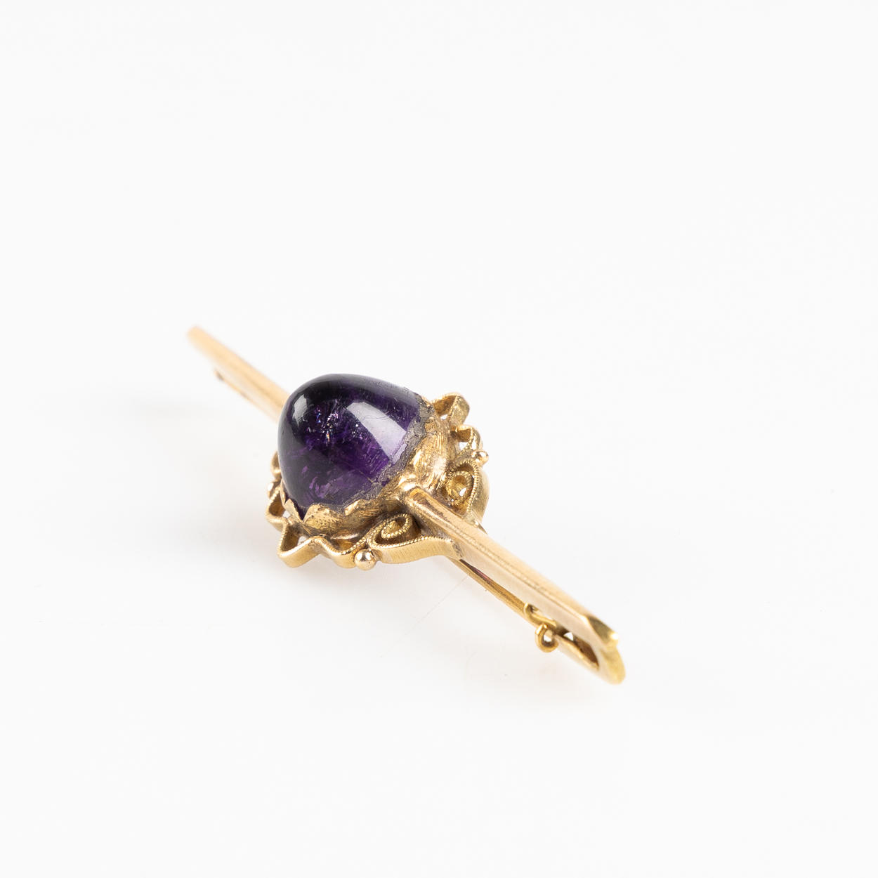 Gerahmt mit Amethyst im Cabochon-Schliff. Gestempelt. L etwa 6,5 cm. Gewicht ca. 7,9 Gramm.