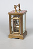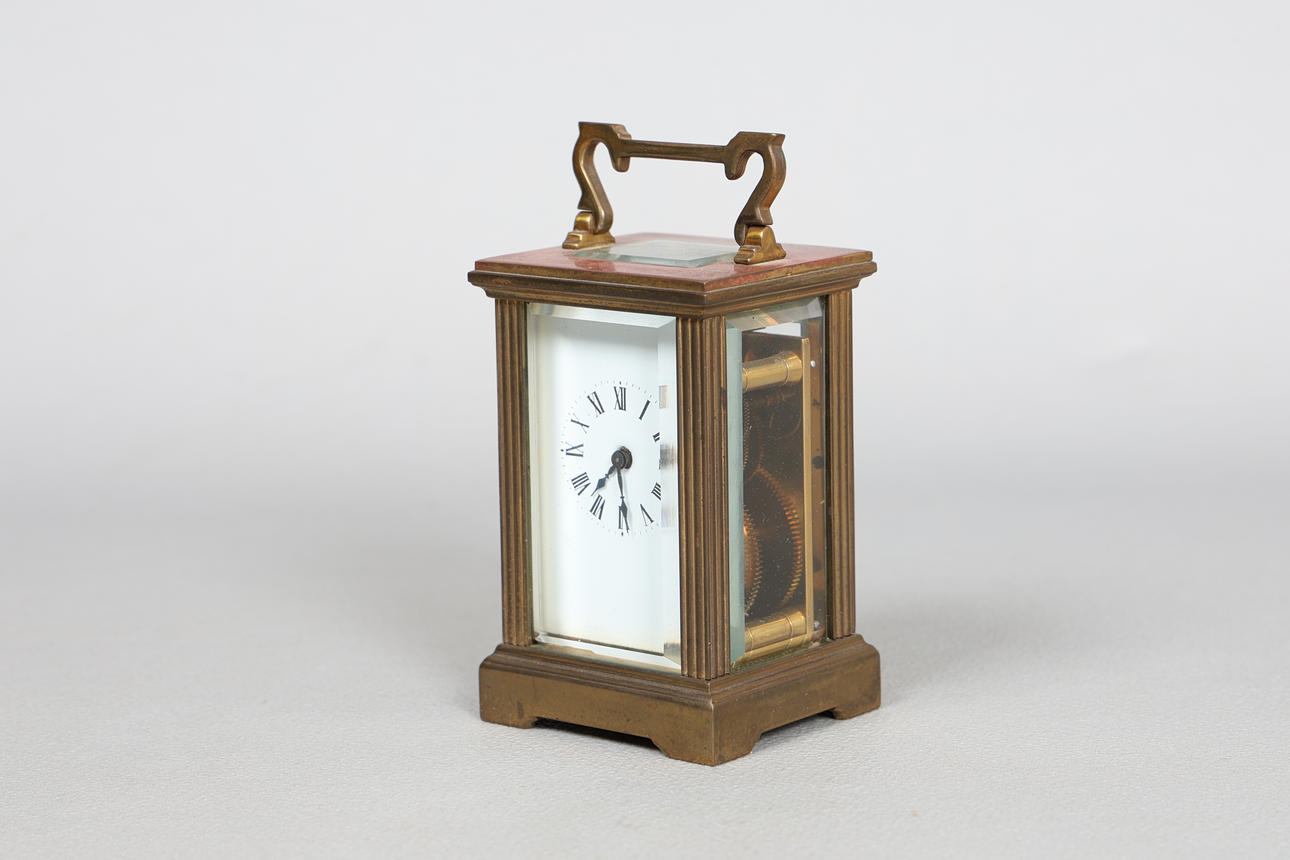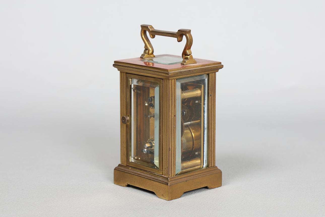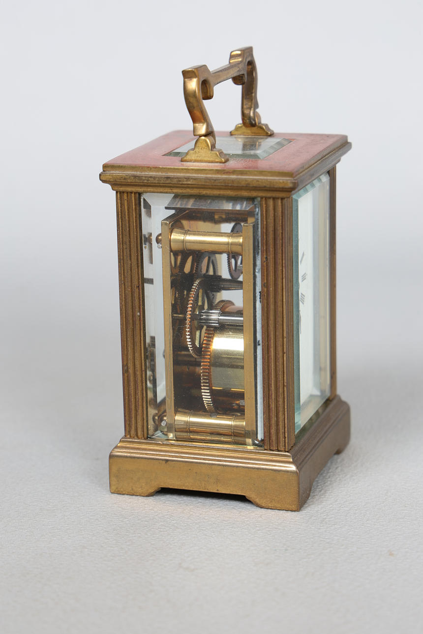 Mit weißem Emailzifferblatt mit schwarzen römischen Ziffern, sichtbarer Hemmungsplattform, geformtem Tragegriff, 8 cm hoch ohne Griff.