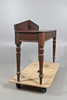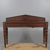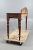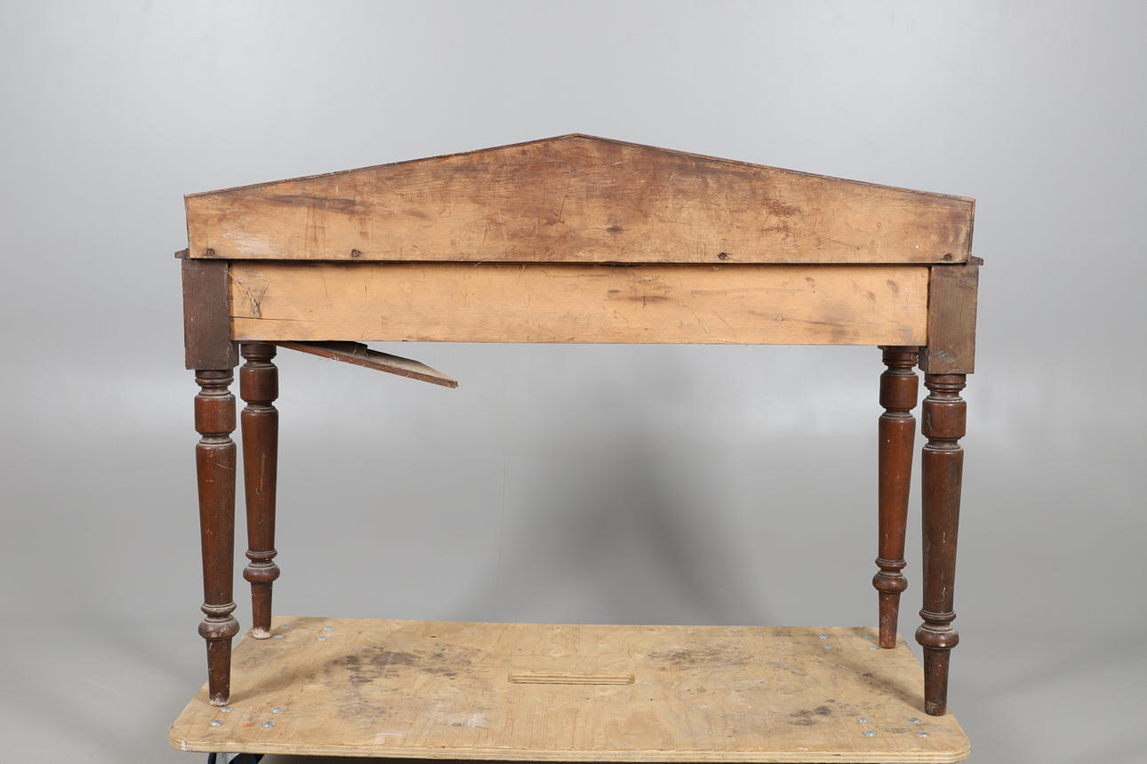 Auf der geformten rechteckigen Platte mit gewölbter Galerierückseite befand sich in der Mitte ein Schild, eine einseitige Friesschublade auf gedrehten, sich verjüngenden Stützen.