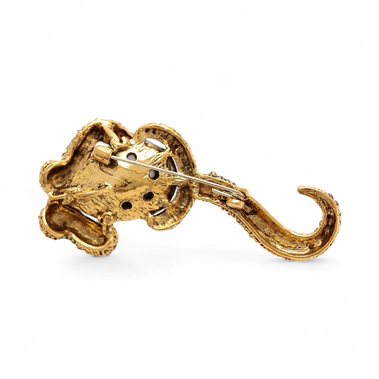 Übergoldetes Metall und mehrfarbige Strasssteine. 7,4 x 3,5 cm 26,2 gr.