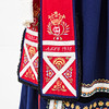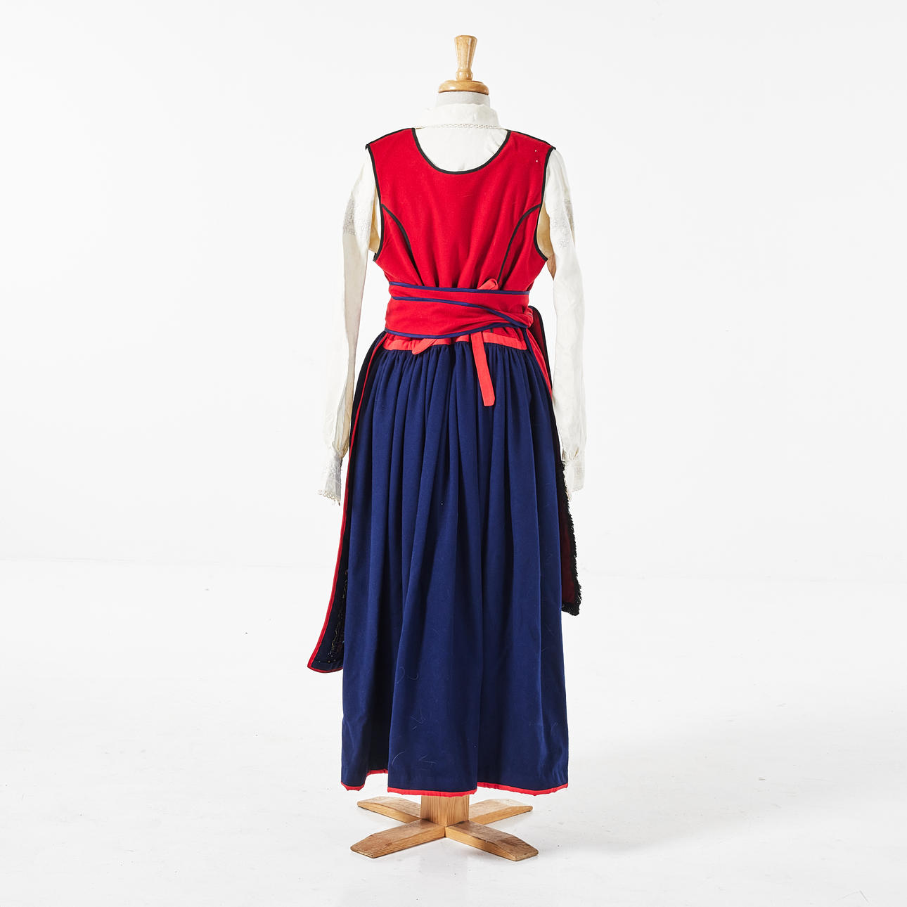 Ein Festtagskostüm für eine verheiratete Frau. Bluse aus Leinen mit Stickerei und Spitze. Rock, Schürze, Gürtel und Mieder aus Wolle mit Stickerei und genähten Bändern.