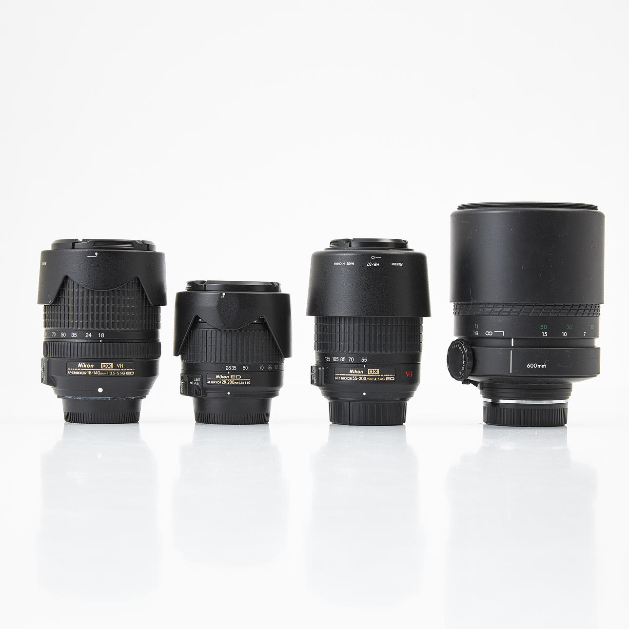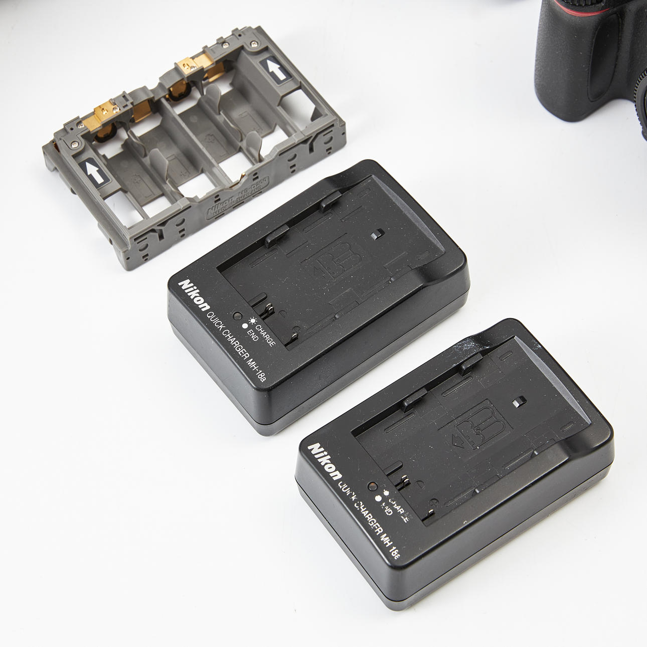 4347397. NIKON, 2 Kameragehäuse, 4 Objektive, Kabel, Ladegeräte usw.