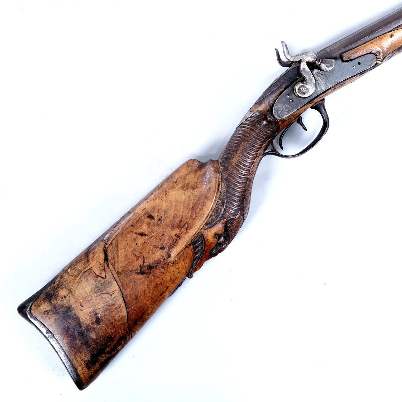 Doppelläufig. Geschnittenes Netzdekor sowie Rotwilddekor Glattrohr.