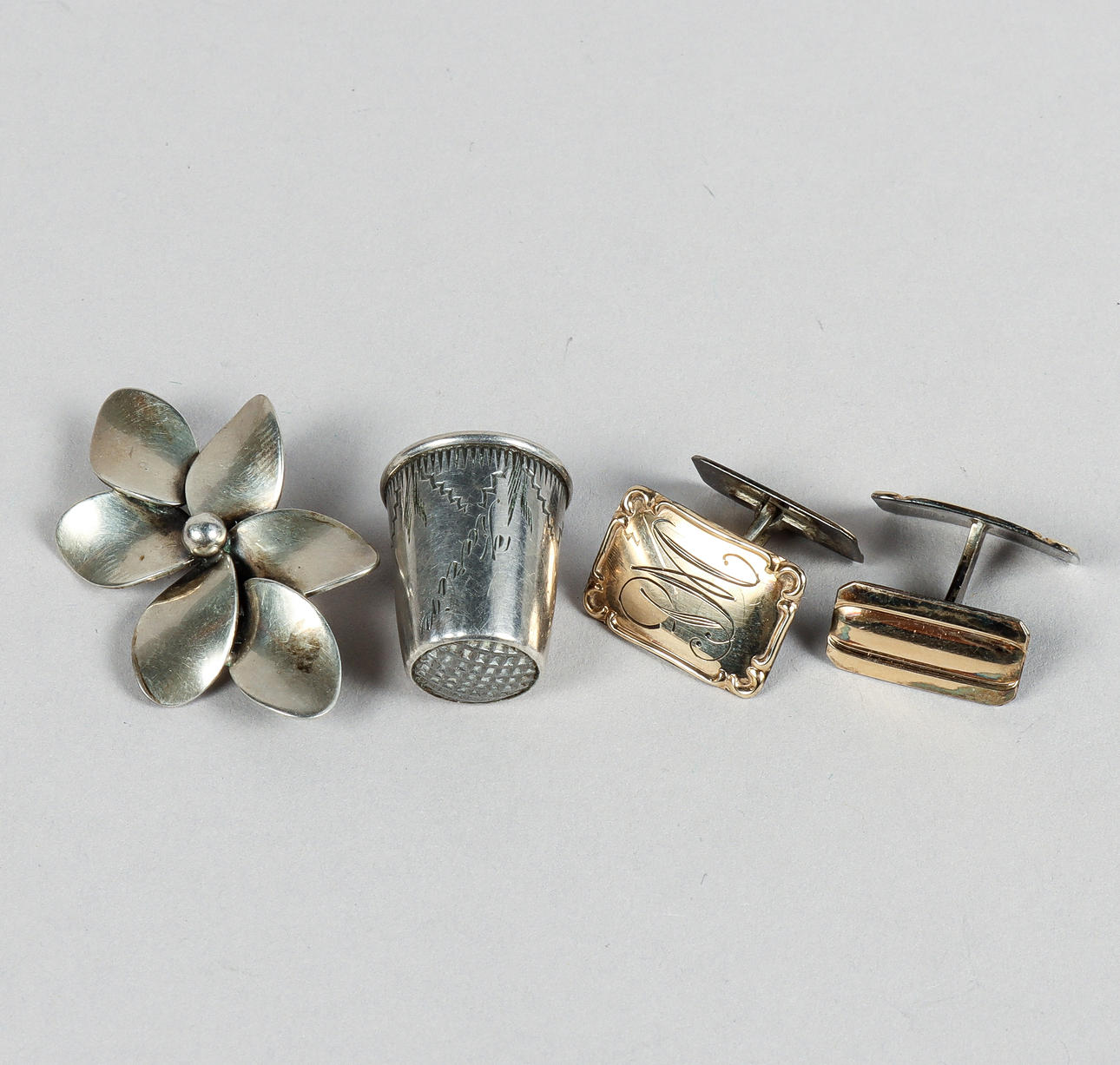 Brosche, Paar Manschettenknöpfe und Fingerhut.