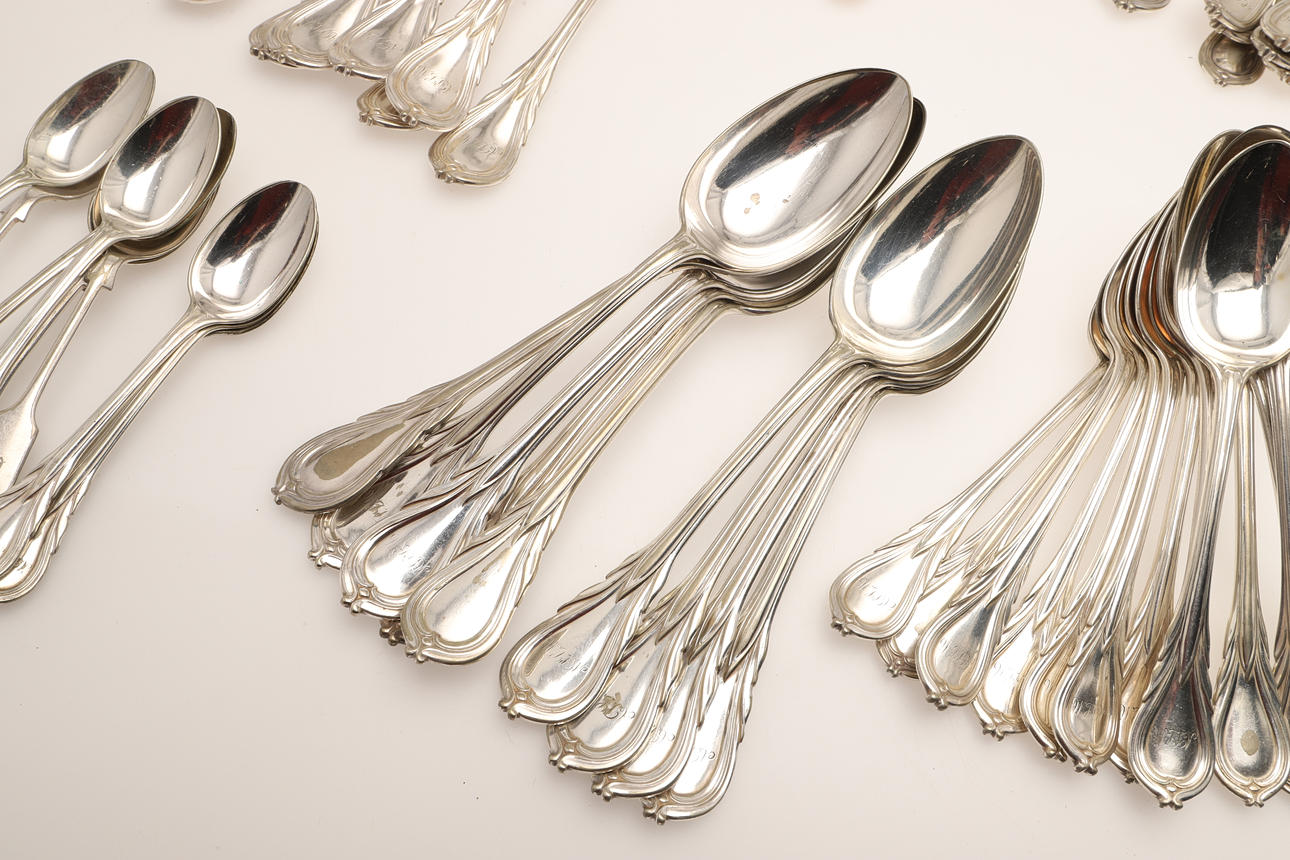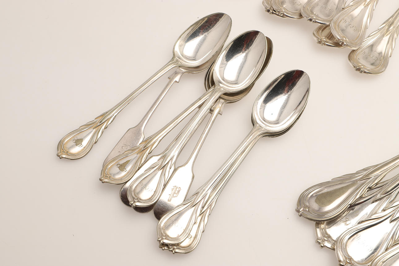 4349953. EIN VIKTORIANISCHER SILBERNER SERVIERLÖFFEL UND EINE GROSSE MENGE SILBERPLATTE, DARUNTER EIN TEIL DER KANTINE MIT BESTECK MIT LILIENMUSTER.