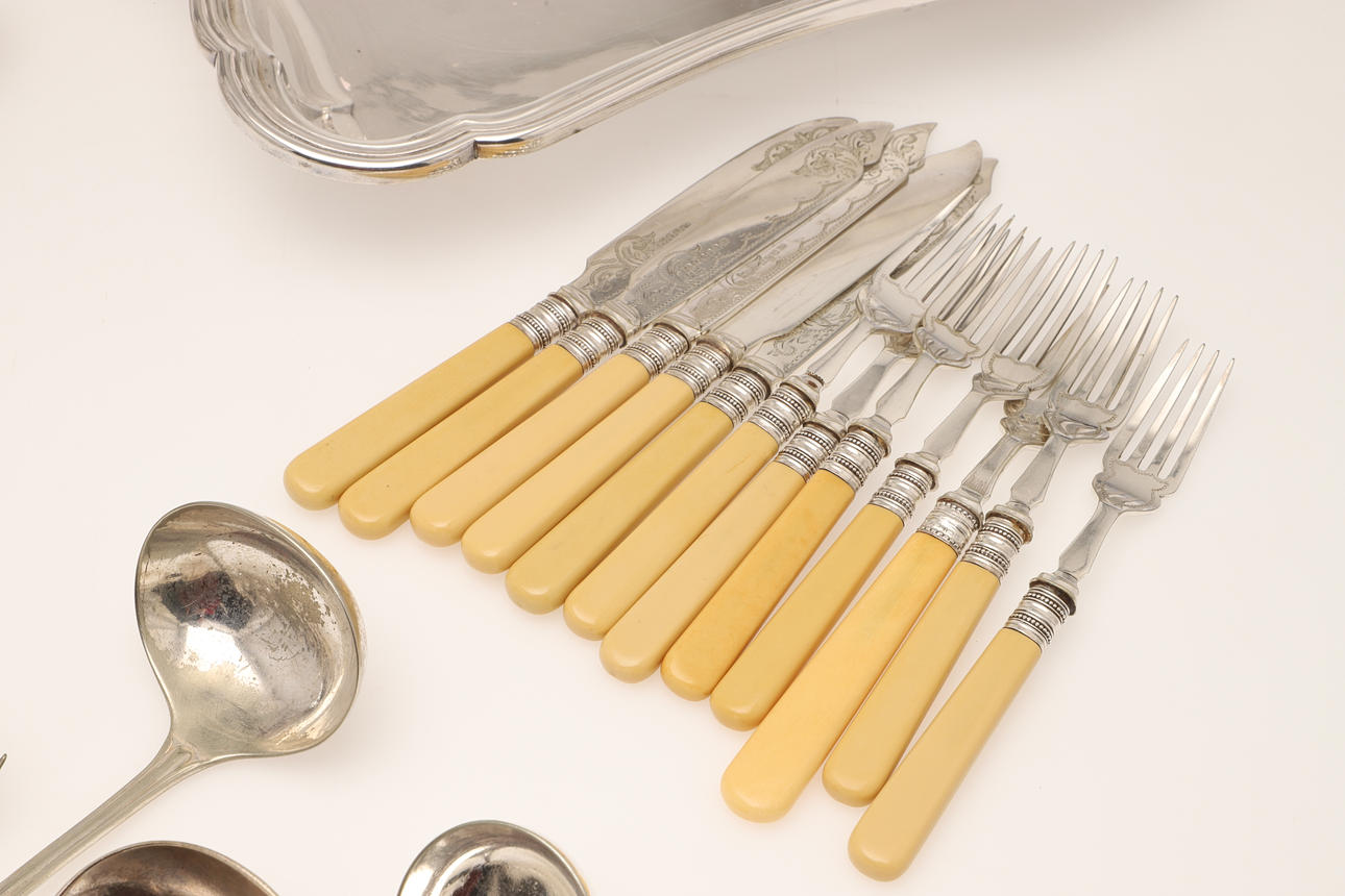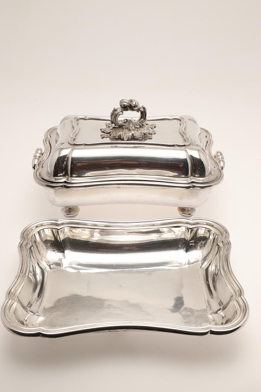 Zusammen mit einer großen Menge an versilbertem Besteck, zwei Vorspeisen, das größte Teller ist 19 cm hoch x 32 cm lang x 22 cm tief.