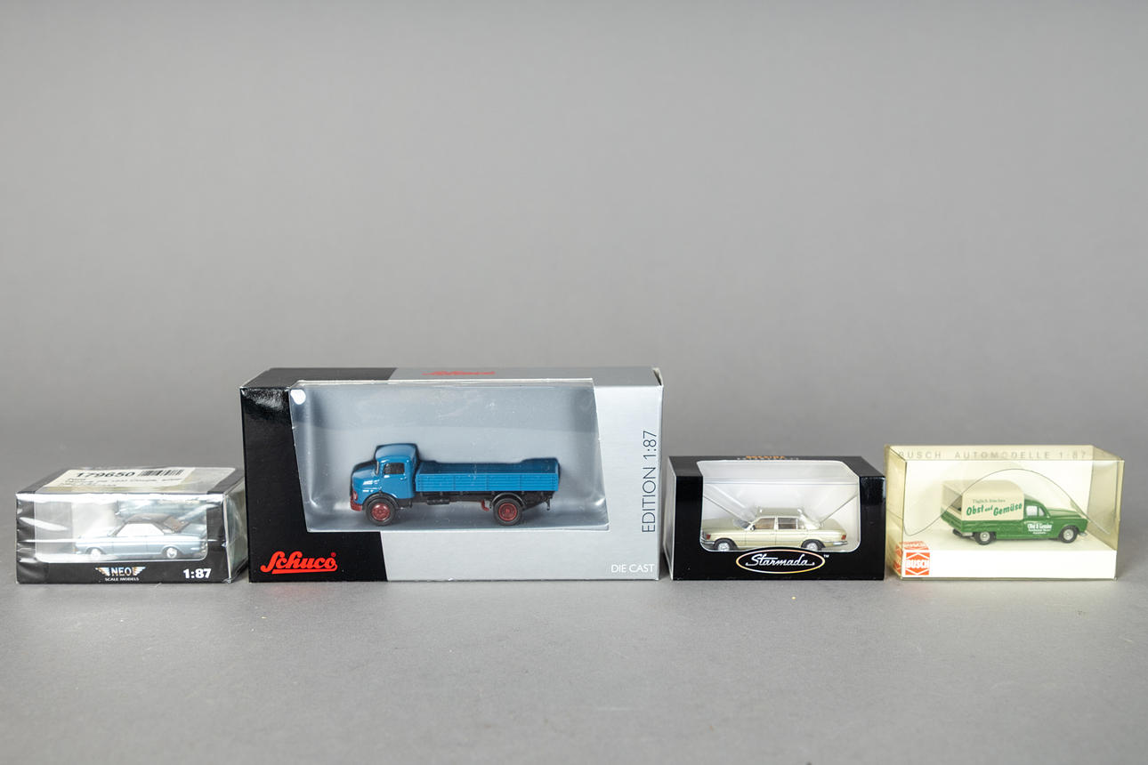 18 Autos von Brekina im Kunststoffbox, 3 von Schuco, 8 von Busch, verschiedene Hersteller.