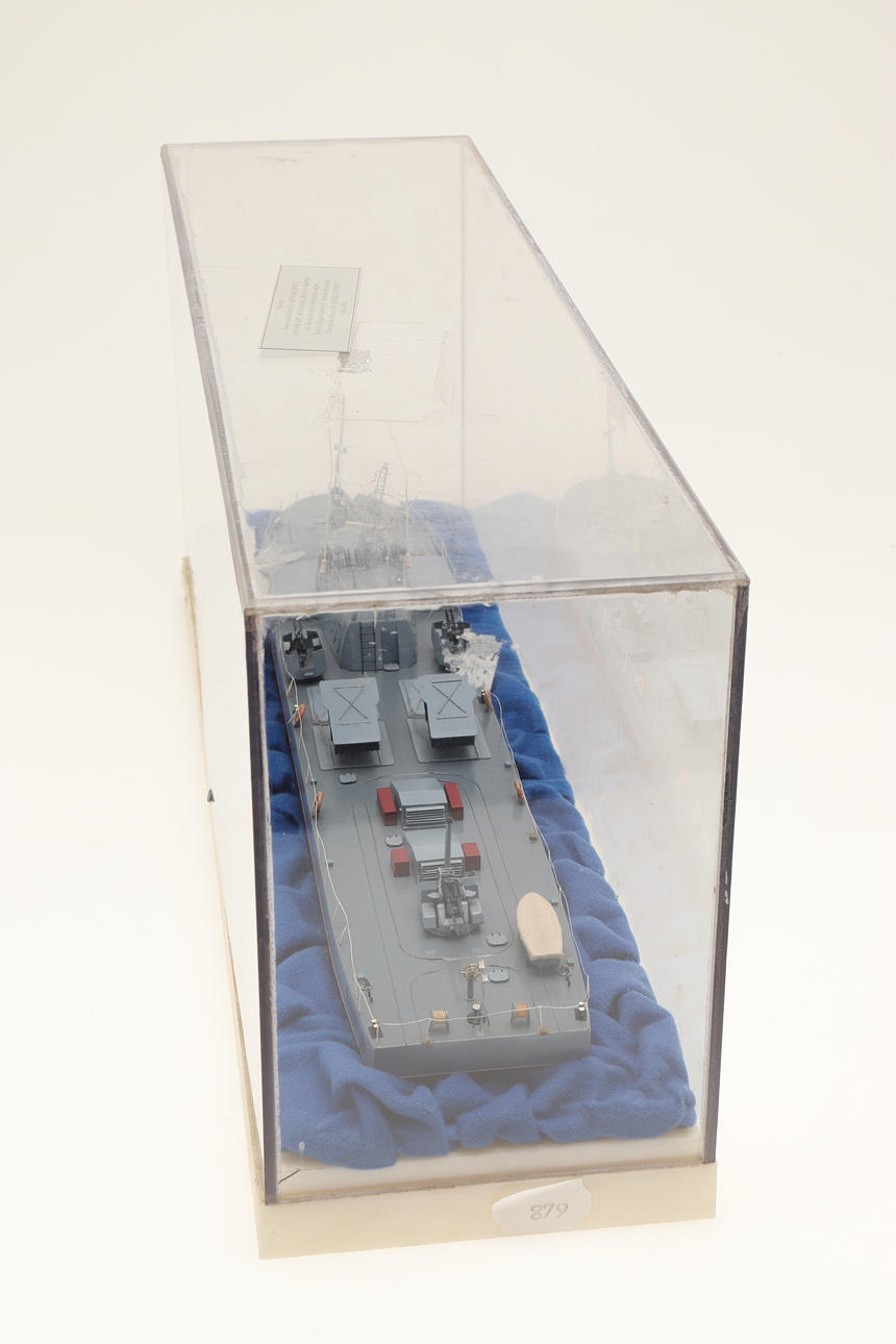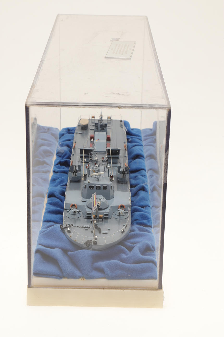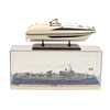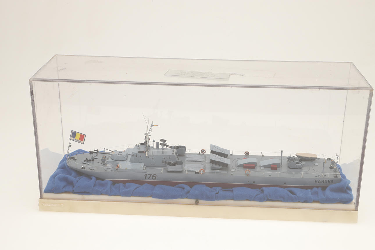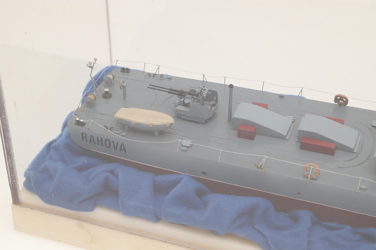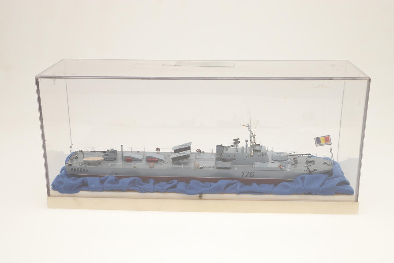 Darunter ein Modell eines rumänischen Marinebootes „Rahova“ in einem Plexiglasgehäuse (51 cm breit, 23 cm hoch), außerdem ein Holzmodell eines Schnellboots auf einem Holzsockel (39 cm lang). (2).