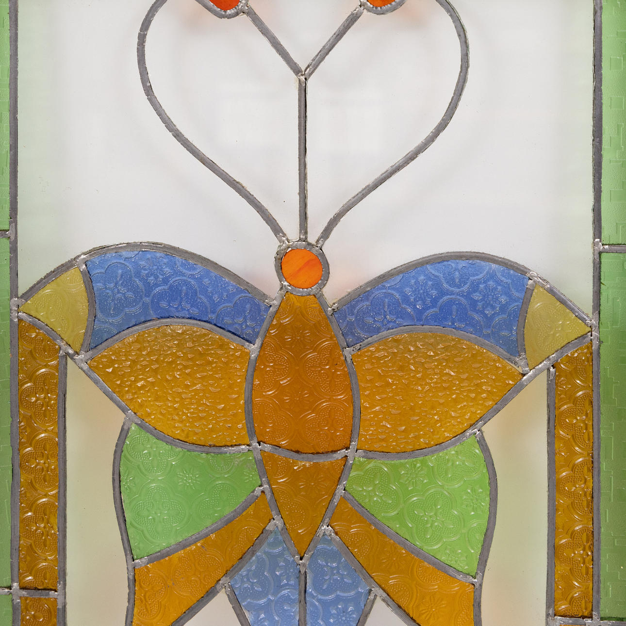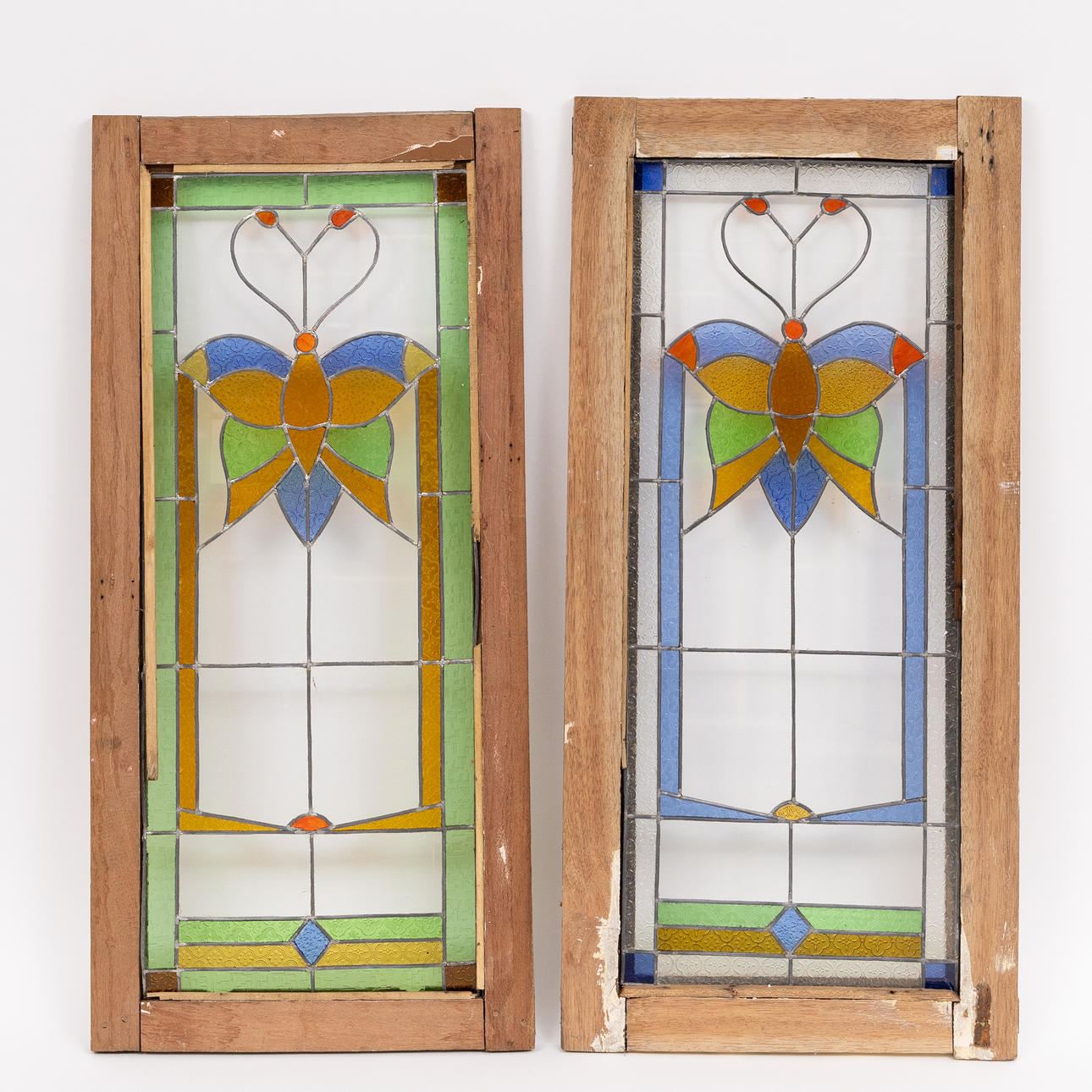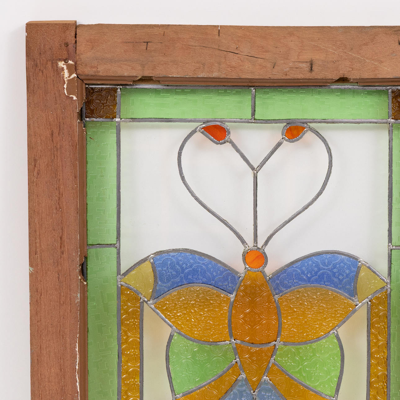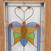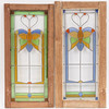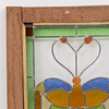 Motiv mit Schmetterlingen, Glasmalerei, Fensterrahmen aus Teakholz.