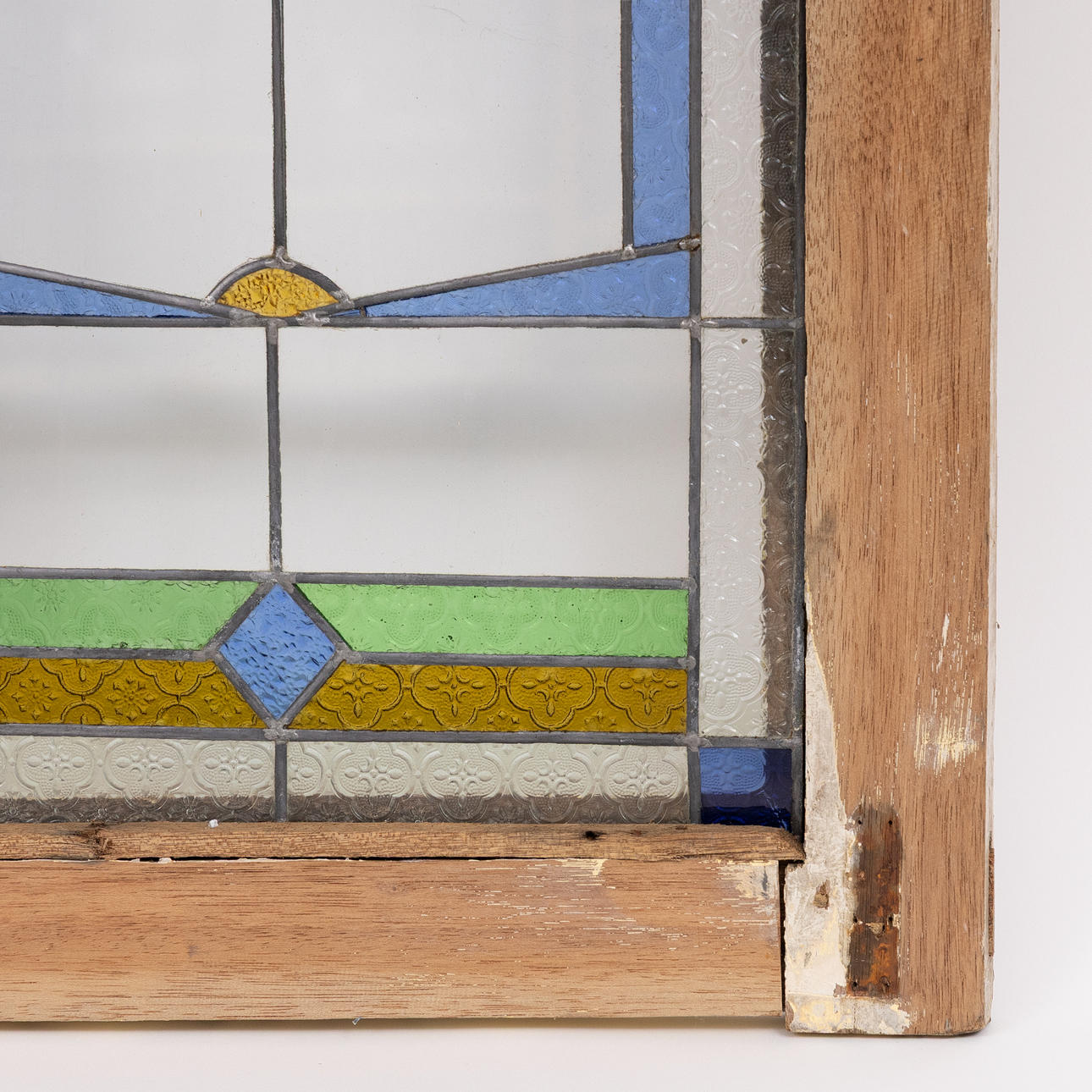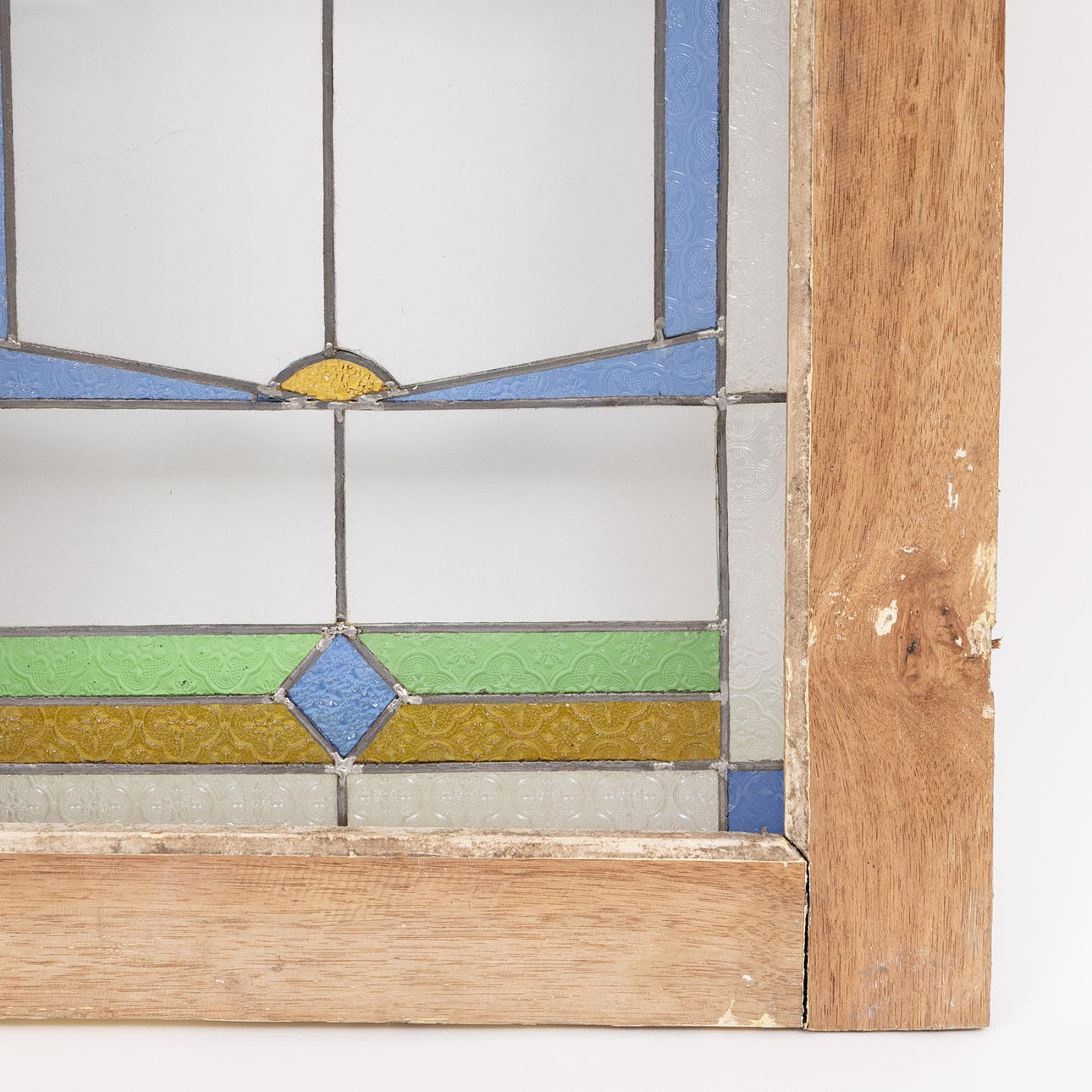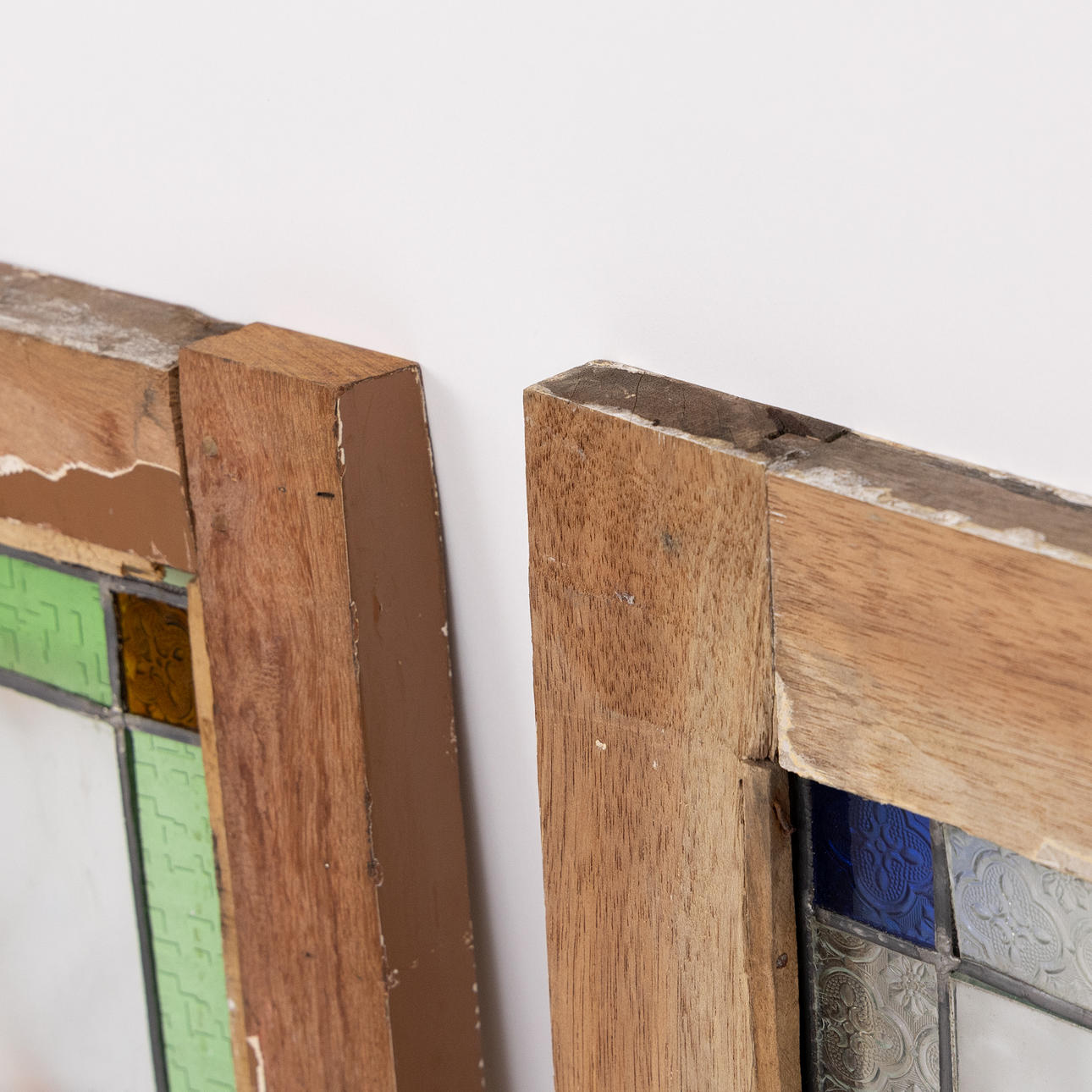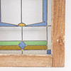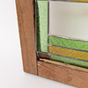 Motiv mit Schmetterlingen, Glasmalerei, Fensterrahmen aus Teakholz.