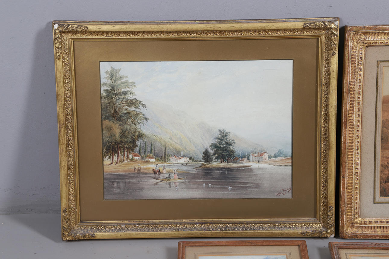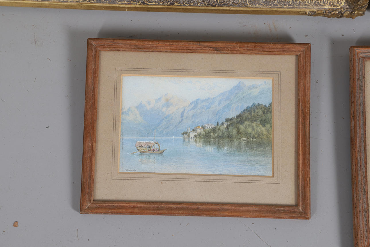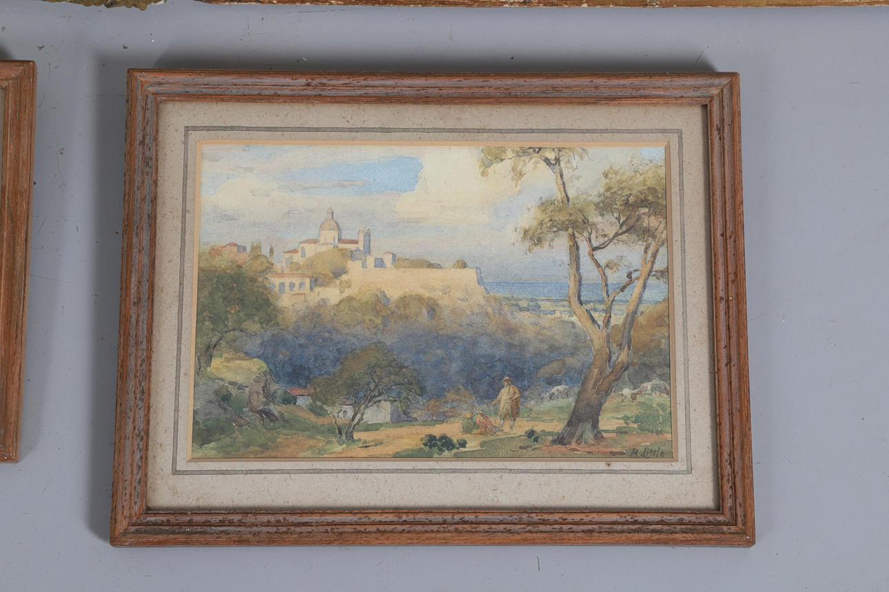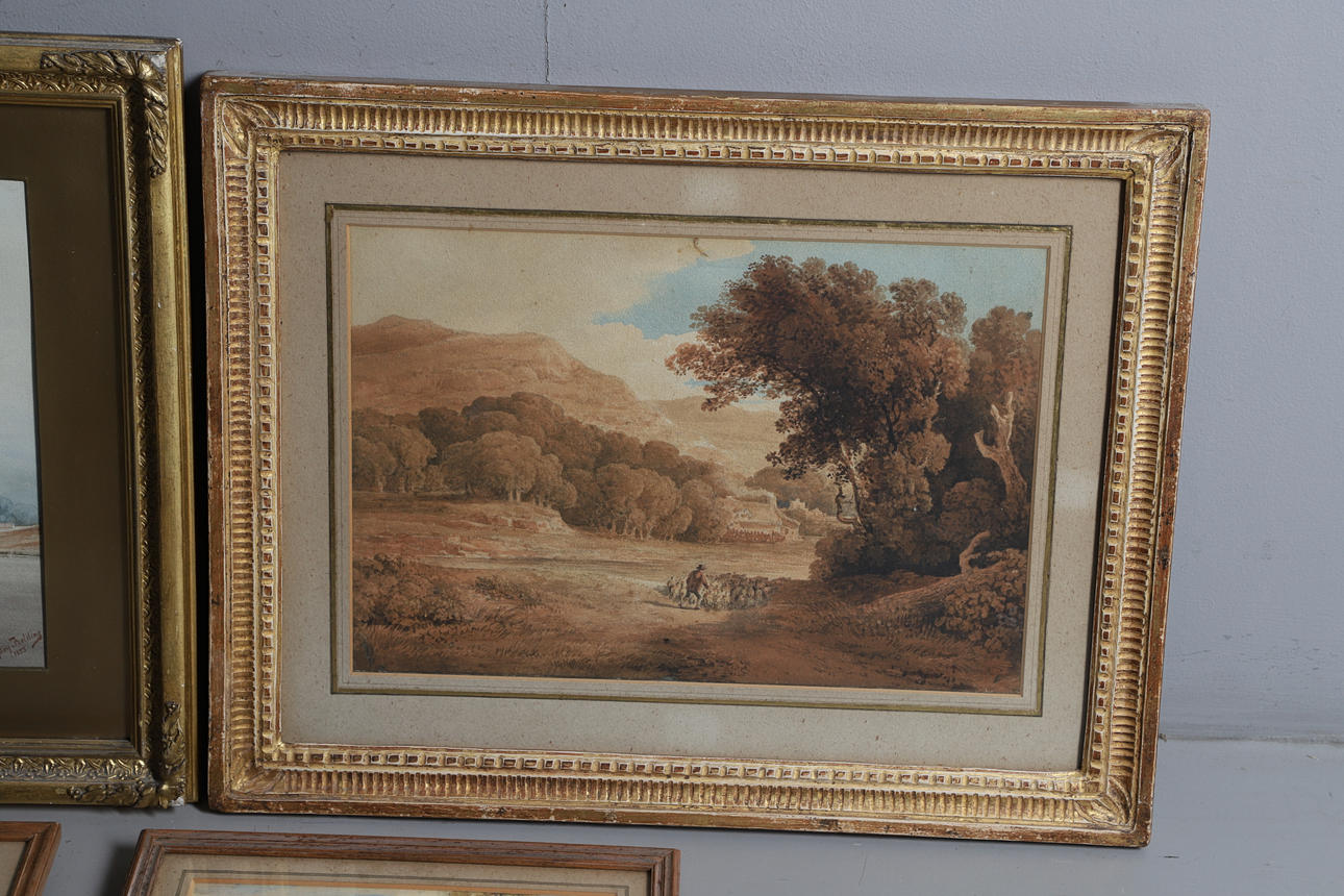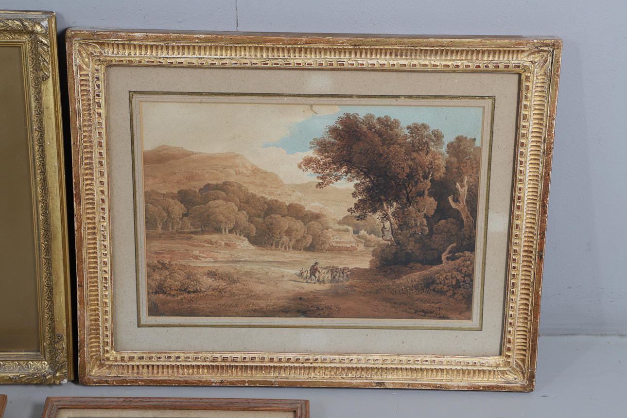 Bestehend aus einer Landschaft im Stil von Copley Fielding, signiert und datiert, 29,5 x 39,5 cm.; eine Landschaft mit einem Hirten und Schafen, Stil von Joshua Cristall, 27,5 x 40 cm.; eine Szene, möglicherweise auf den italienischen Seen, von Francis George Coleridge, signiert, 11 x 17,5 cm.; und ein weiteres italienisches Thema von Robert Little, signiert, 16 x 24 cm.; insgesamt 46 x 58 x 8 cm.