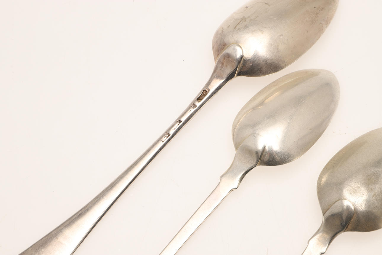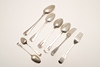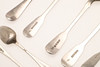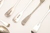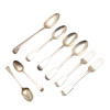 Hauptsächlich Geigenmuster, darunter drei silberne Tafellöffel von William IV und ein Teelöffel, zwei silberne George IV-Tafelgabeln und zwei frühere silberne Löffel (ein Servierlöffel (Länge 22 cm) und ein Teelöffel. Verschiedene Hersteller und Daten. Gesamtgewicht 9,5 Unzen (8).