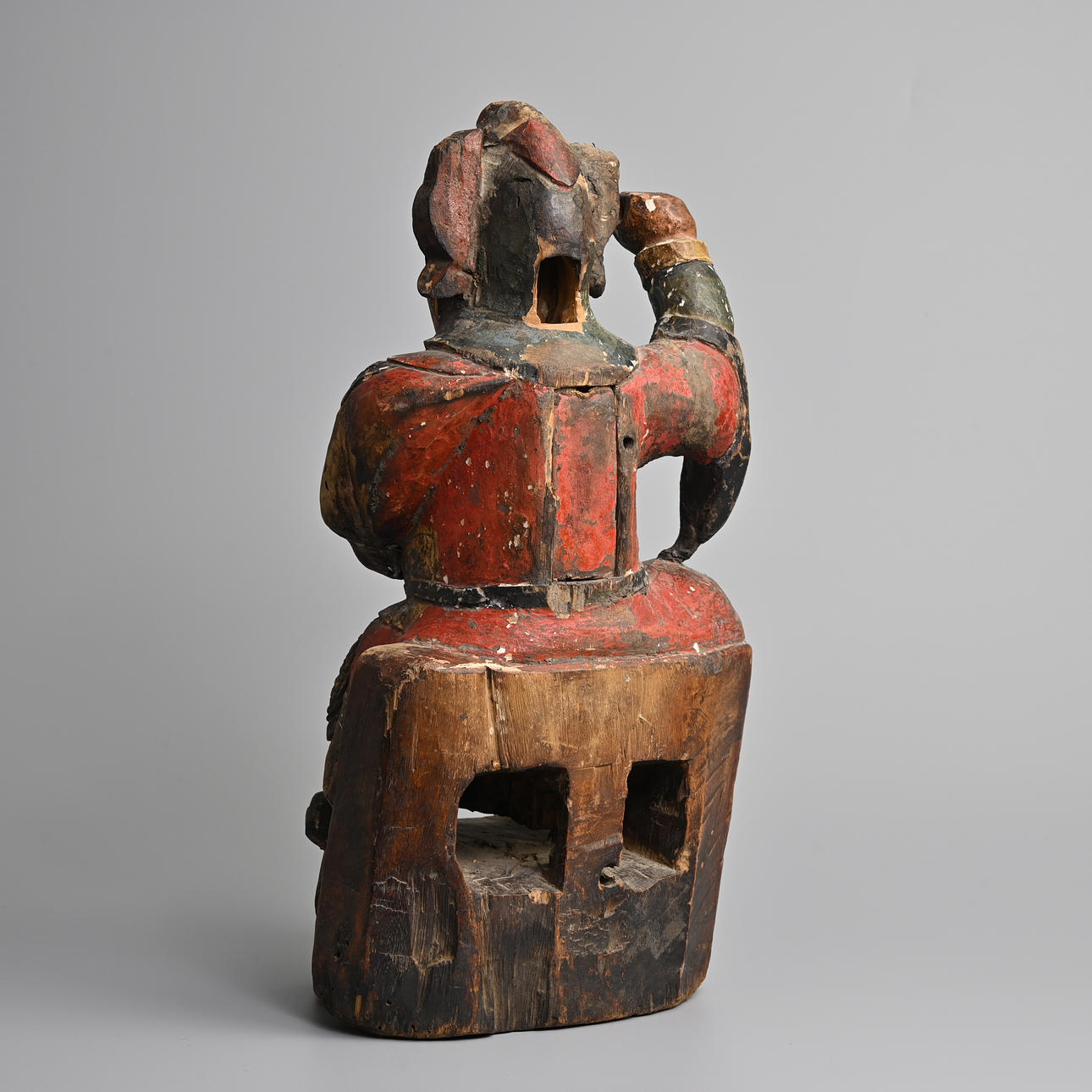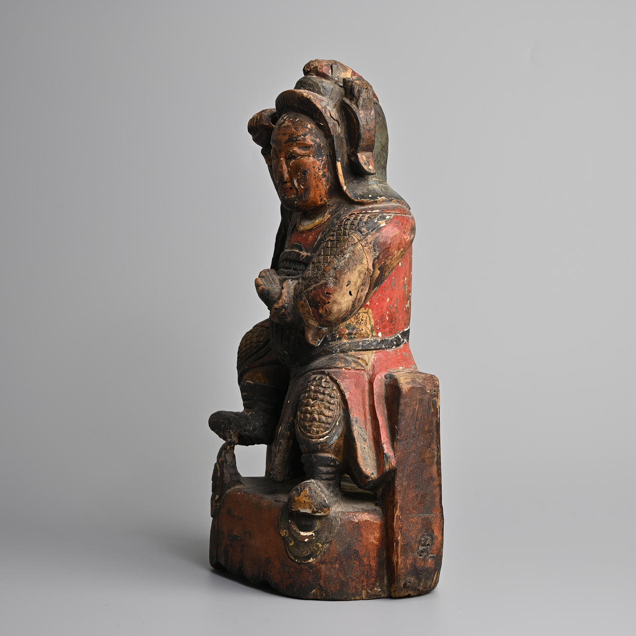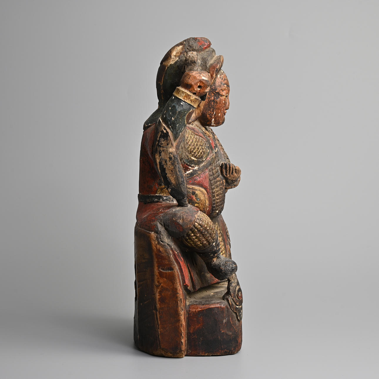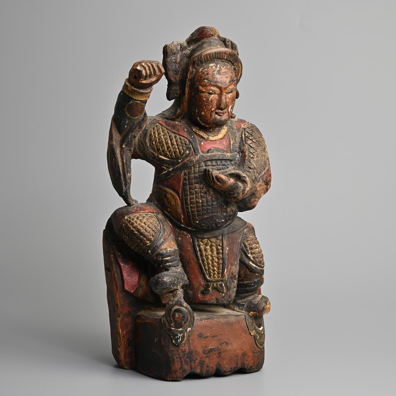 4356342. EINE CHINESISCHE, AUS HOLZ GESCHNITZTE UND POLYCHROM BEMALTE FIGUR EINES KRIEGERS AUS DER MING-DYNASTIE (1368-1644).