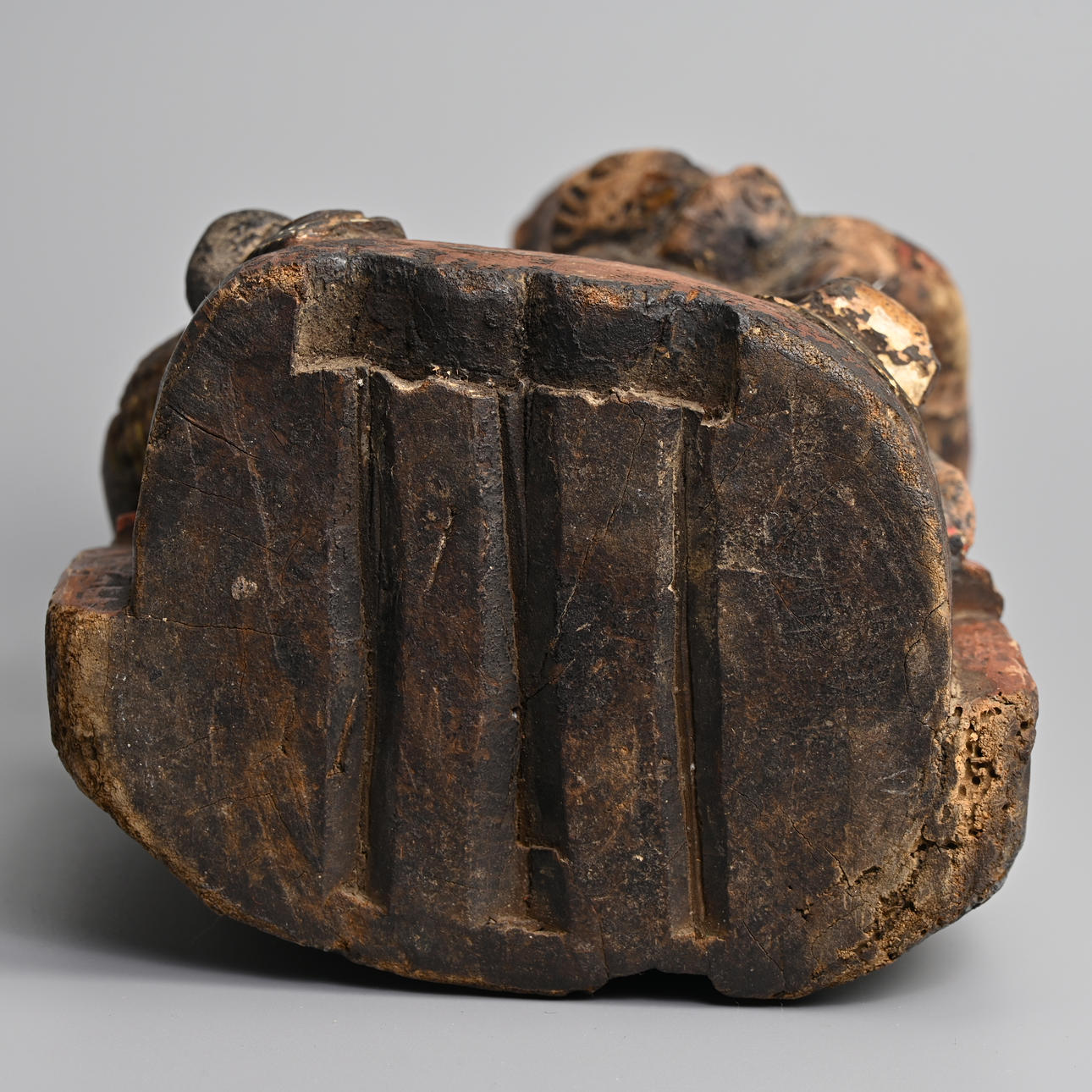Einige alte Reparaturen am Rand des Kopfschmucks, Löcher für die Befestigung auf der Rückseite gebohrt, kleine alte Holzwurmlöcher am linken Ellbogen und am Rand des Ansatzes, am rechten Ärmel rissig, einige typische Gebrauchsspuren und leichte Pigmentabplatzungen.