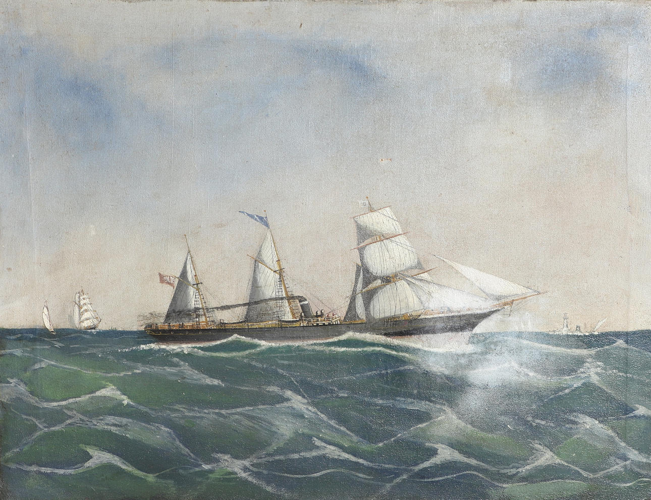 Ein Öl auf Leinwand, gemalt mit einem Mastboot in einer Meereslandschaft und mit einem Leuchtturm im Hintergrund. Auf der Rückseite signiert, 'P.S.N. CO Valdiria 1875. Ungerahmt und unsigniert, 60 cm x 46,5 cm.