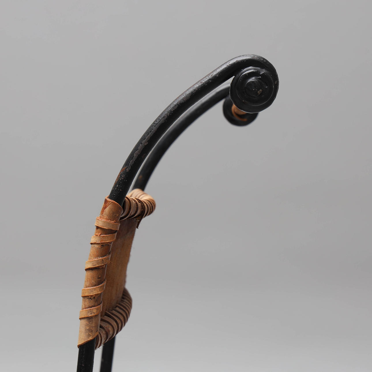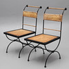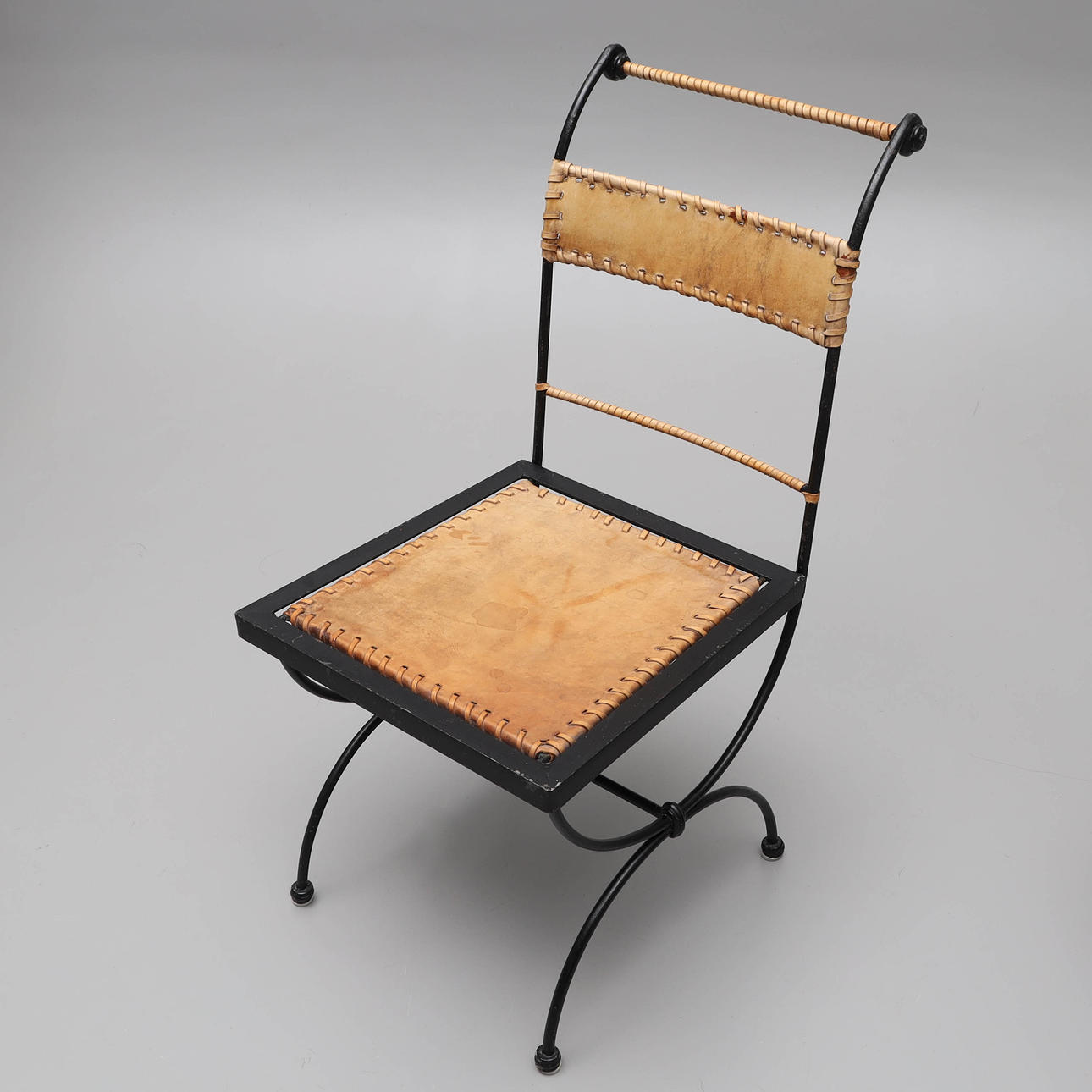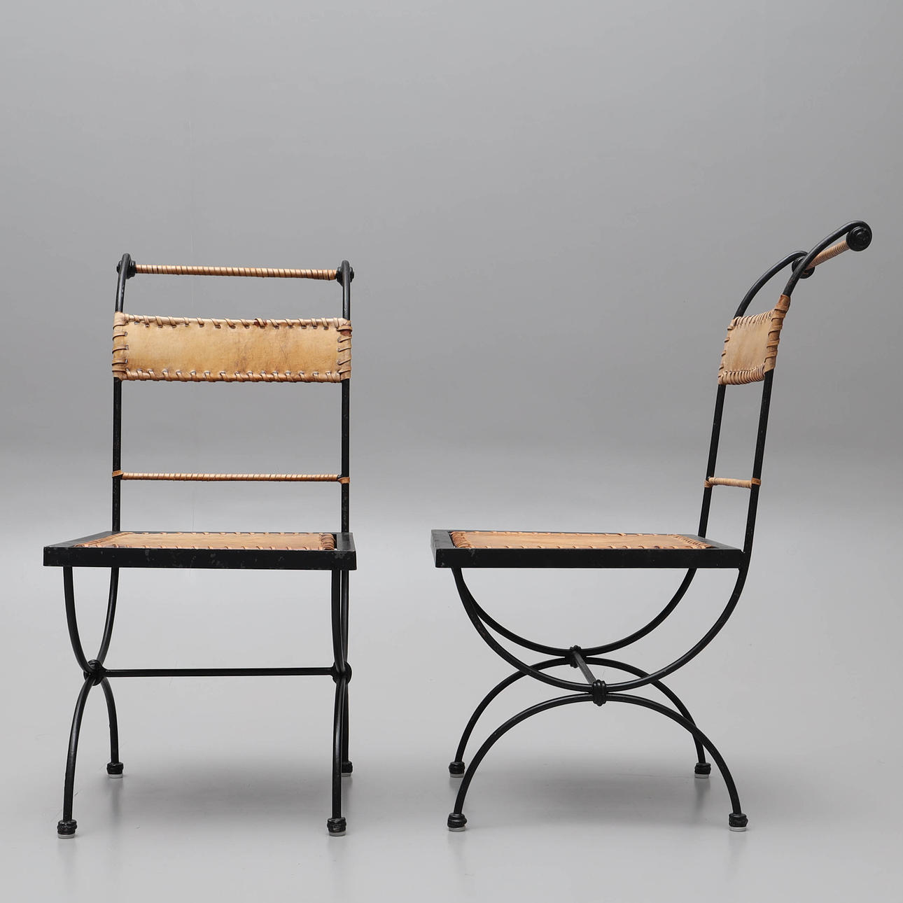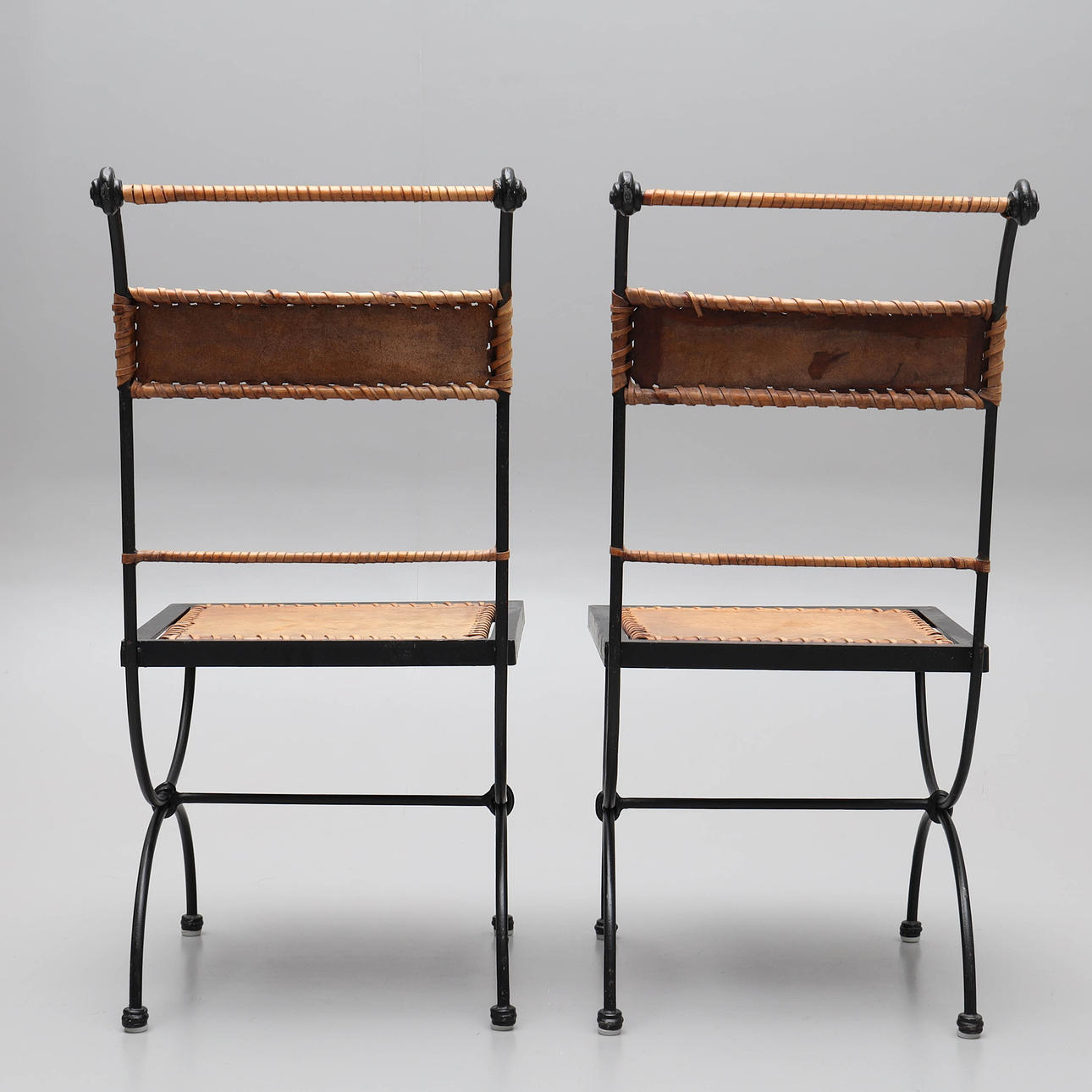 4357808. Ein Paar schmiedeeiserne Stühle mit Lederbezug im spanischen Stil.