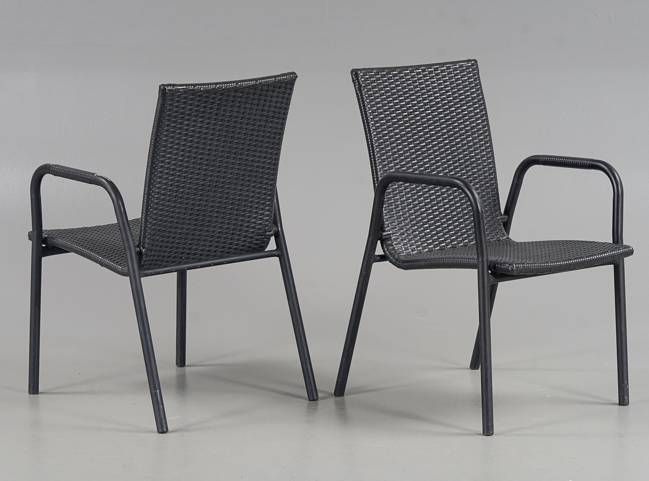 Rahmen aus Aluminium, Polster aus geflochtenem Kunststoff. Stapelbar