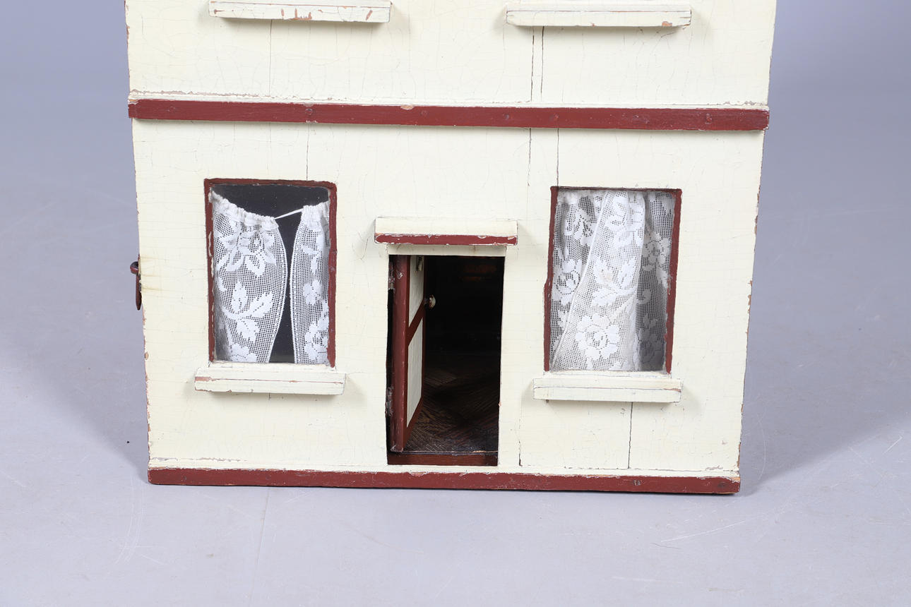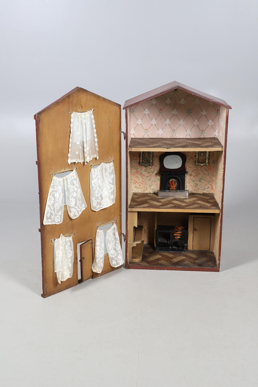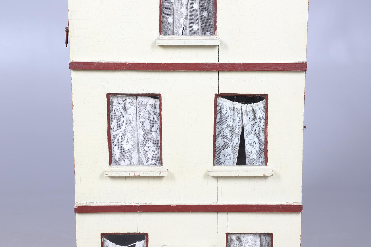 Möglicherweise Ende des 19. Jahrhunderts, dreistöckiges Stadthaus mit Innenausstattung wie Kaminen, Herd und Kommode. Der Innenraum ist über eine Tür an der Vorderseite zugänglich. 84,5 cm hoch, Tür 43,5 cm breit.