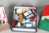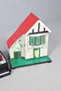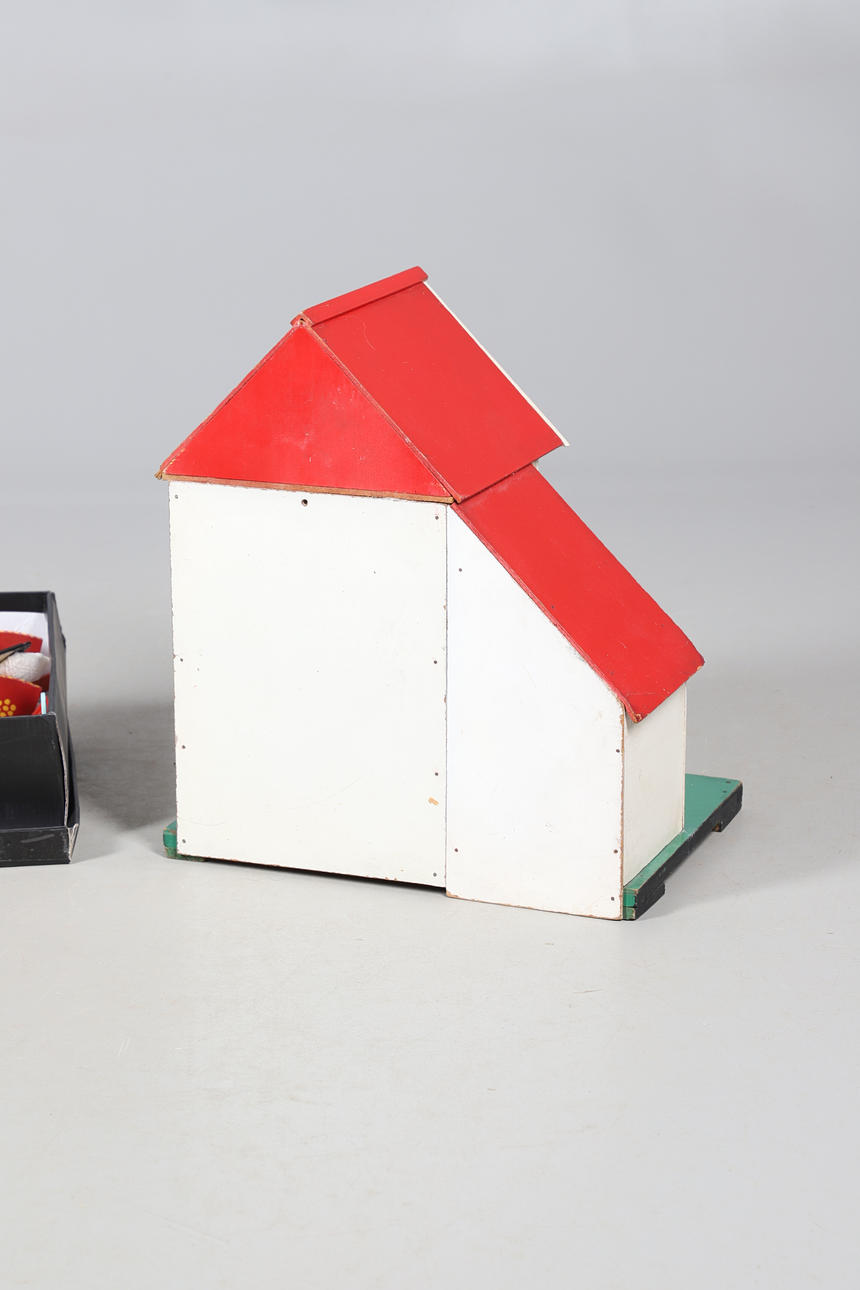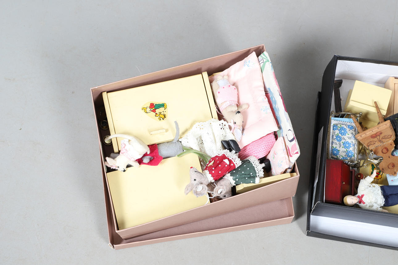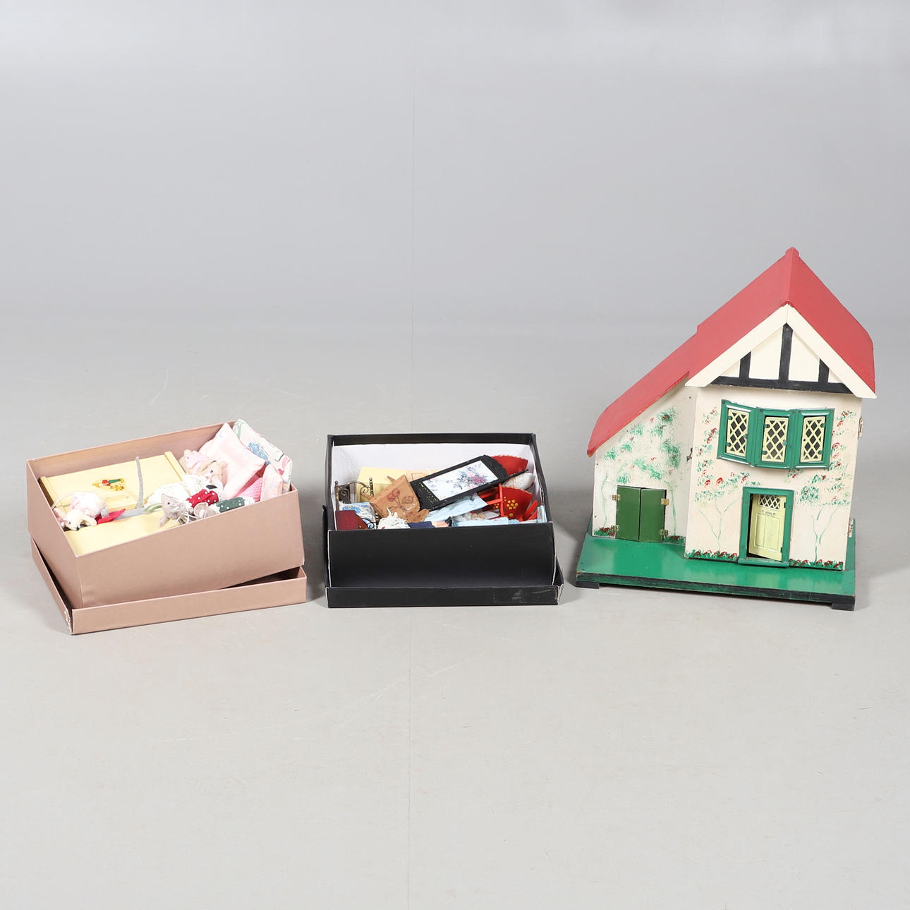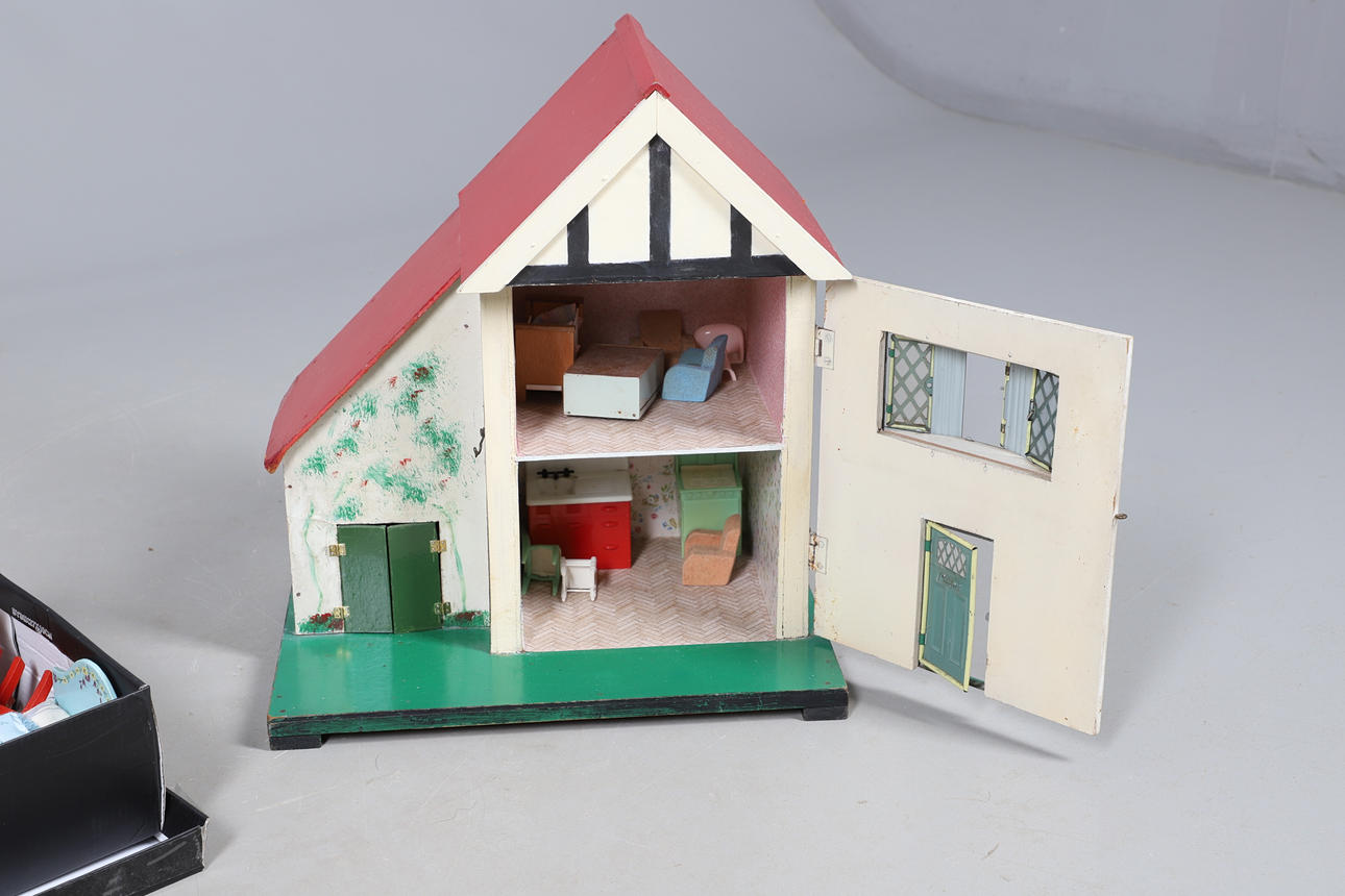 Ein kleines zweistöckiges Puppenhaus mit Innenausstattung und einigen Möbeln (41 cm hoch), Sockel 36 cm x 26 cm. Ebenfalls mit zwei kleinen Boxen mit Puppenhausmöbeln und Accessoires.