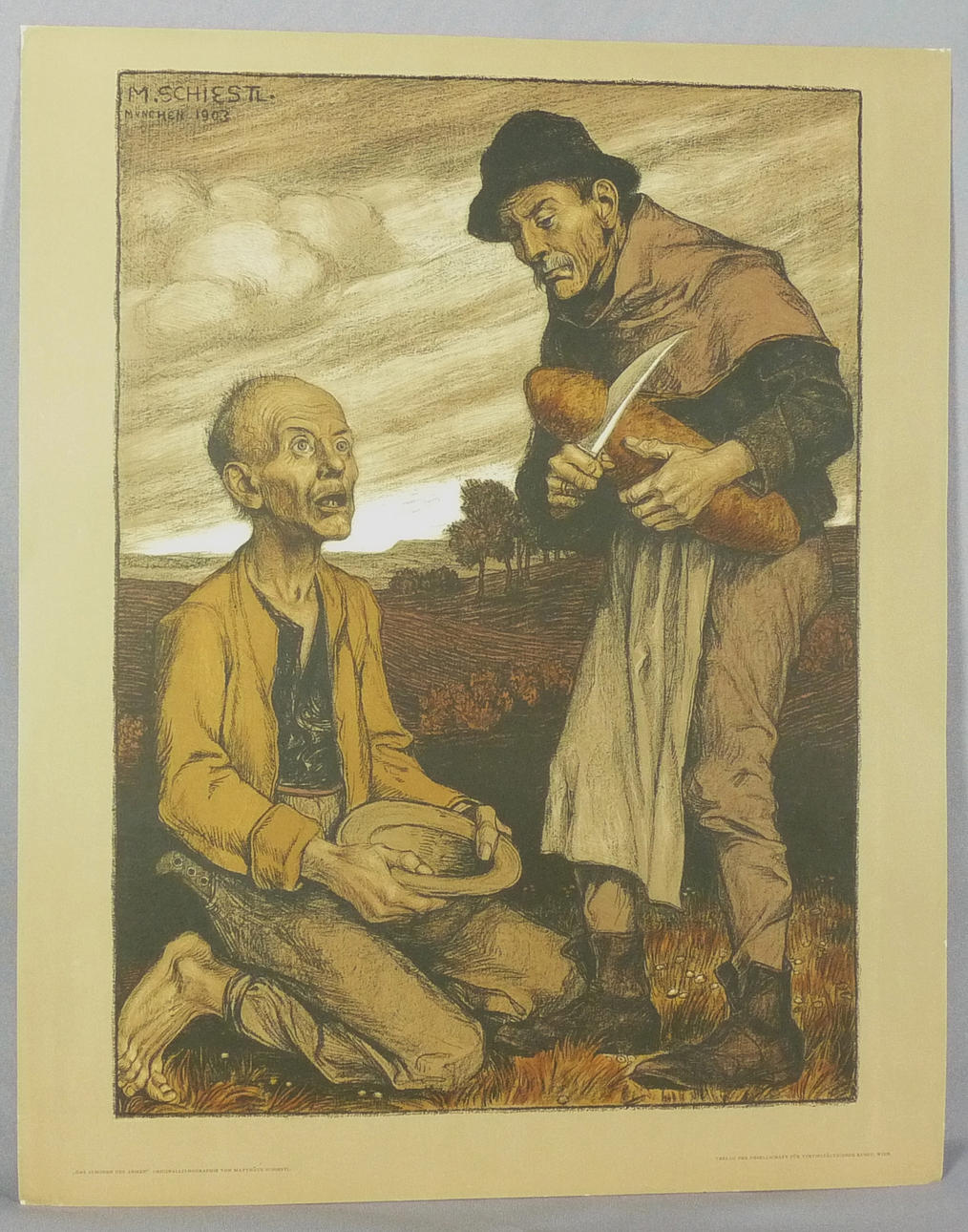 (Salzburg 1869-1939 München) Kniender Bettler erhält Nahrungsalmosen vor einer Landschaft mit Feldern. Lithographie. In der Platte links oben monogrammiert und datiert „München 1903"; links unten betitelt. 36 x 50 cm (Platte). - Lit. Thieme/Becker 30, Vollmer 4.
