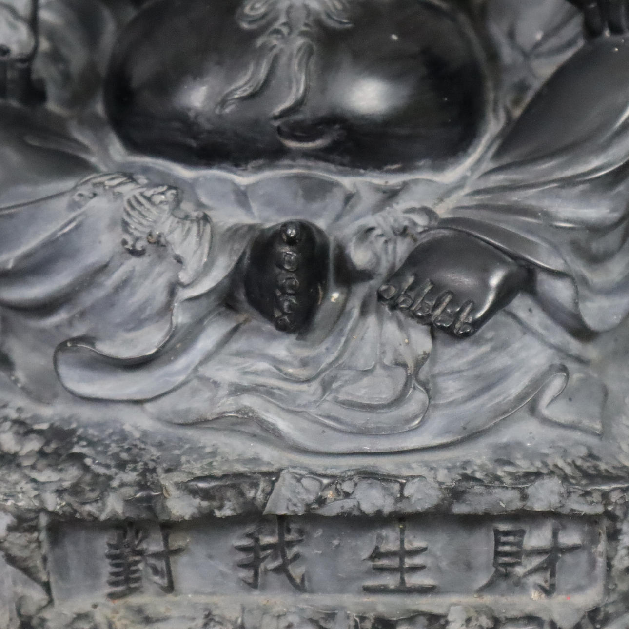 der lächelnde Glücksbuddha mit zahlreichen Glückssymbolen, H.ca.22,5cm, Gewicht ca. 6,8 kg.